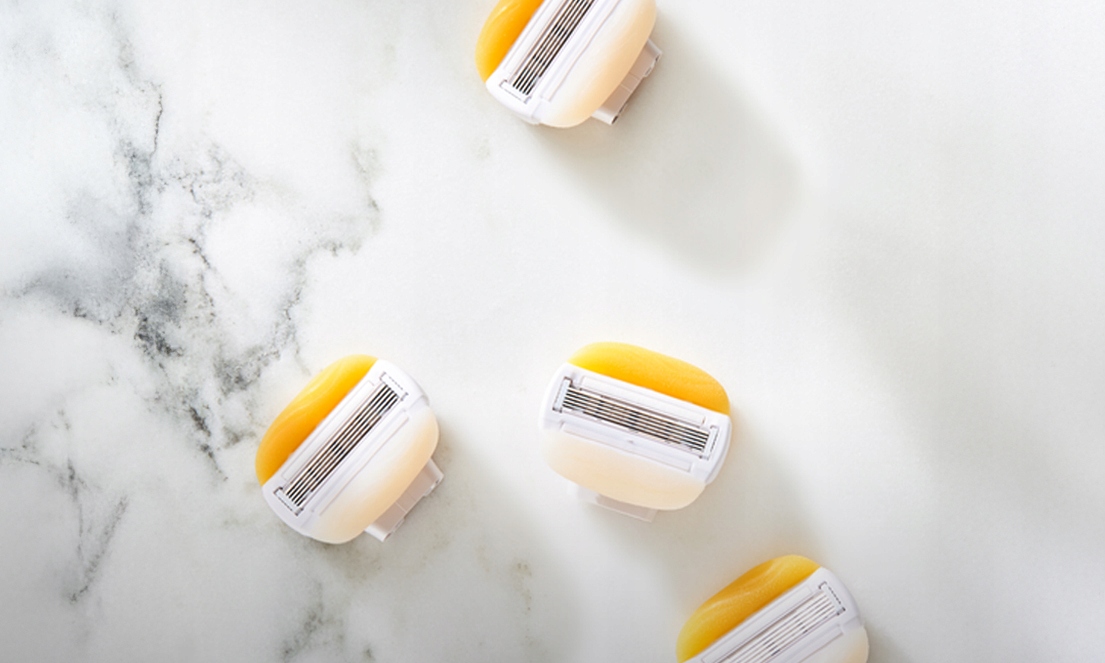 Nałóż wymienną głowicę na rękojeść maszynki Venus i zablokuj ją. Wymień głowicę, gdy tylko paski nawilżające Olay zużyją się lub ostrza ulegną stępieniu. Przed użyciem namocz głowicę, aby aktywować taśmy nawilżające Olay, które stworzą na skórze efekt delikatnej pianki.