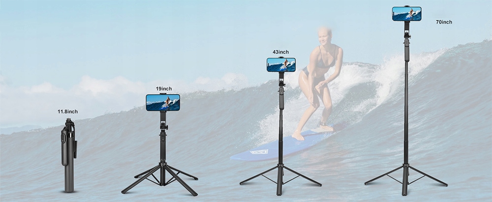 Odłączany pilot obsługuje bezprzewodowe sterowanie za pomocą pilota zdalnego sterowania do 10 metrów. Aktywacja uchwytu do statywu telefonu umożliwia zdalne nagrywanie jednym dotknięciem, co sprawia, że filmowanie jest szybsze i wygodniejsze. Wysoki uchwyt do statywu telefonu jest idealny dla użytkowników, którzy potrzebują zdalnie sterowanego statywu z kijem do selfie do nagrywania wideo.