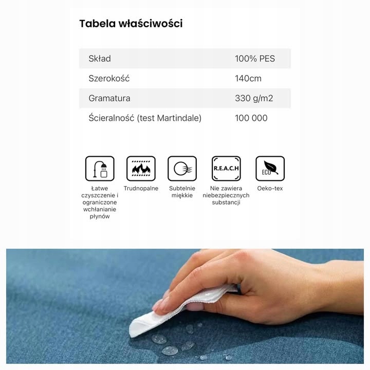 Tkanina pokryta jest specjalną warstwą ochronną, tworząca hydrofobową powłokę zabezpieczającą przed szybkim przesiąkaniem płynów. Zapobiega to natychmiastowemu absorbowaniu wody przez tkaninę, sprawiając że ciecz skrapla się na powierzchni materiału.