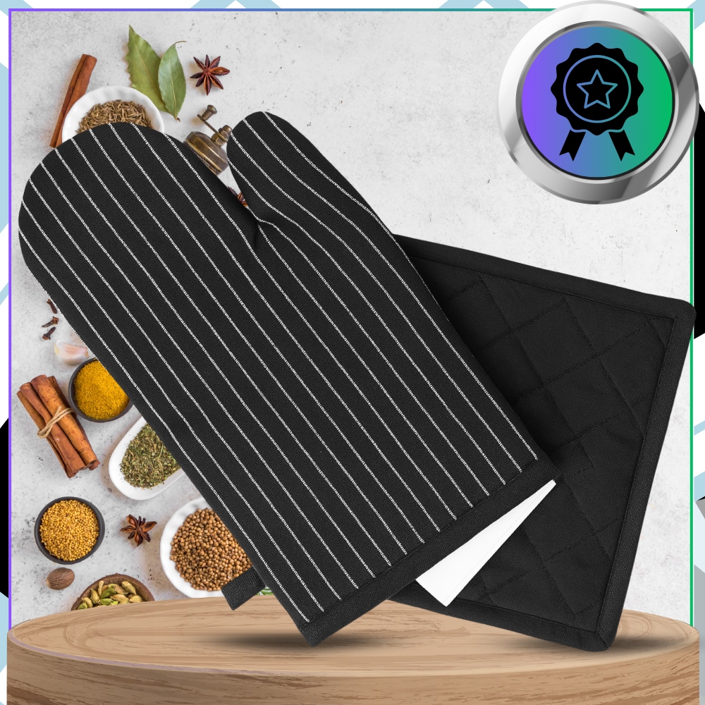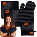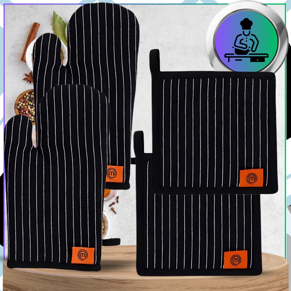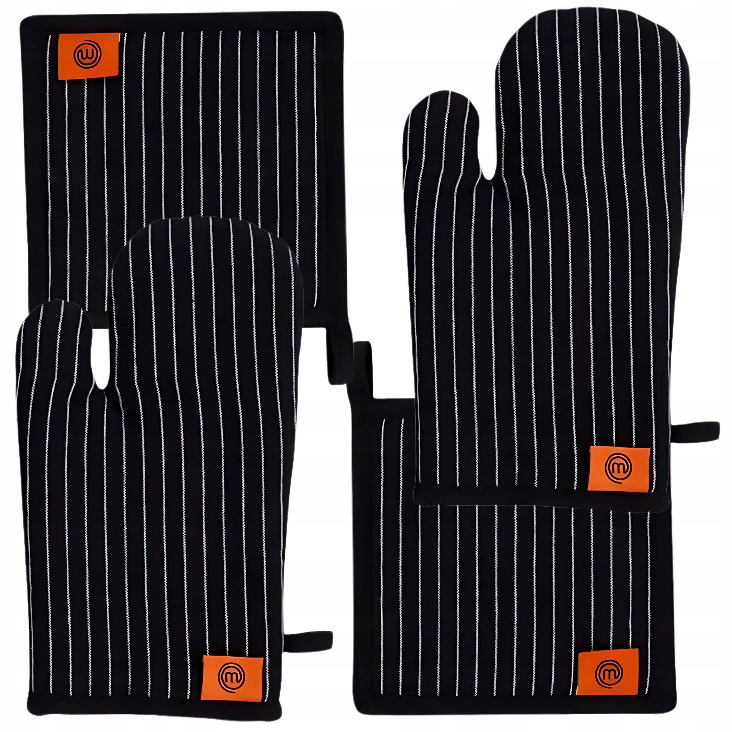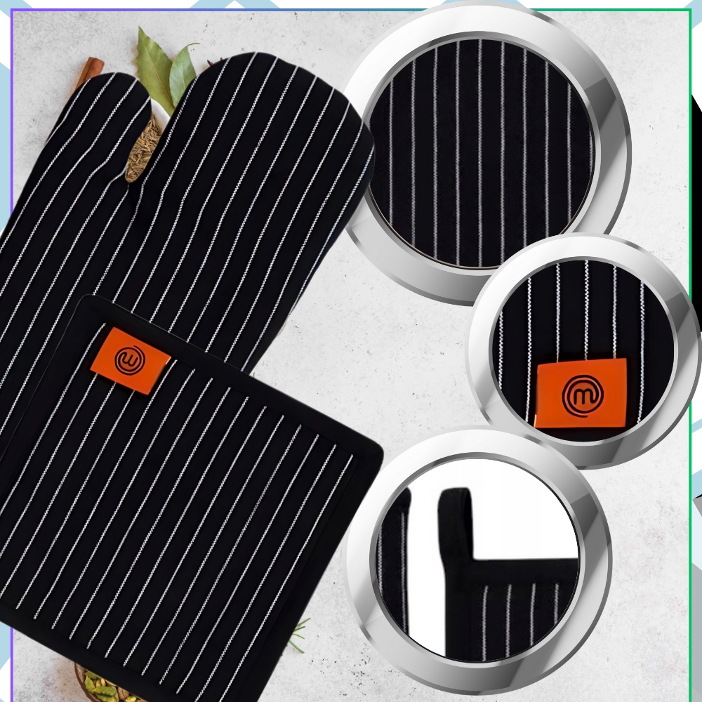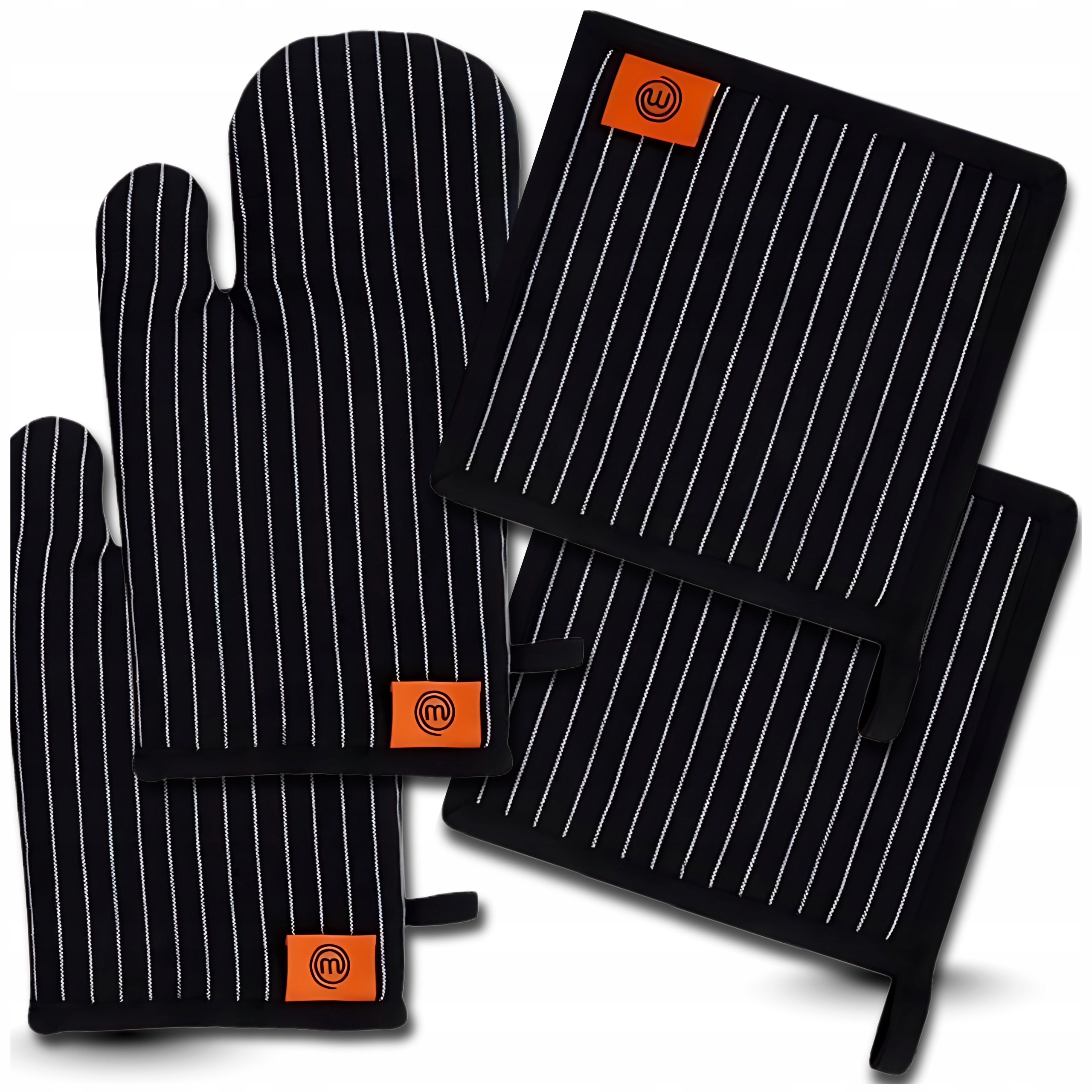 ✅ Design inspirowany popularnym programem kulinarnym MasterChef nadaje zestawowi wyjątkowego charakteru. Klasyczna czerń ze wzorem w paski pasuje do każdej kuchni, podkreślając jej elegancki i nowoczesny styl. To akcesoria, które nie tylko zapewniają ochronę i komfort, ale także świetnie się prezentują, stając się estetycznym elementem wyposażenia.