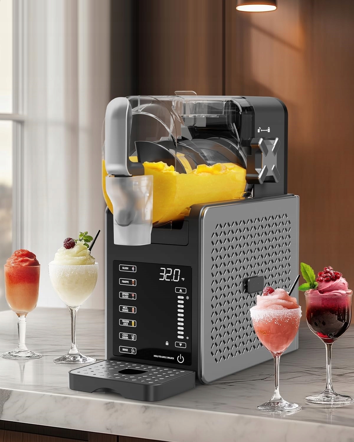 Urządzenie do smoothie posiada jasny wyświetlacz LED i sześć trybów pracy z temperaturą w czasie rzeczywistym oraz dziesięć regulowanych ustawień gęstości, co pozwala na łatwe przygotowywanie napojów smoothie w domu, bez konieczności wychodzenia do sklepu.