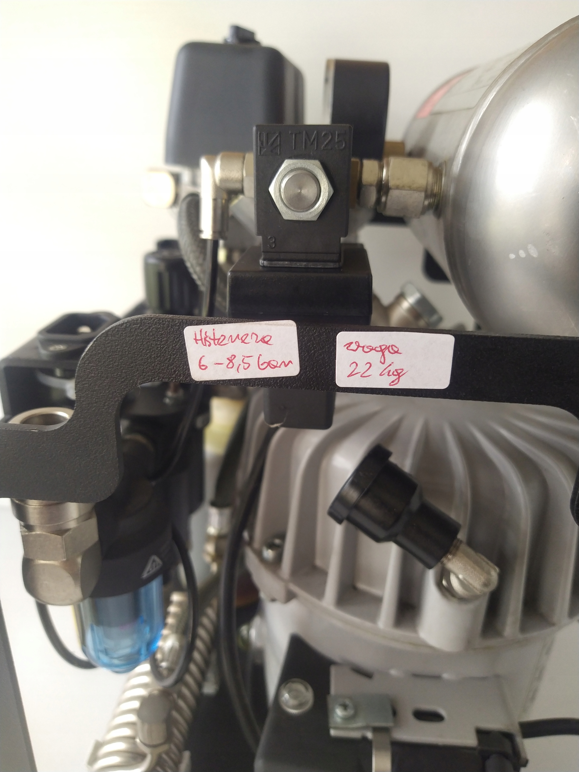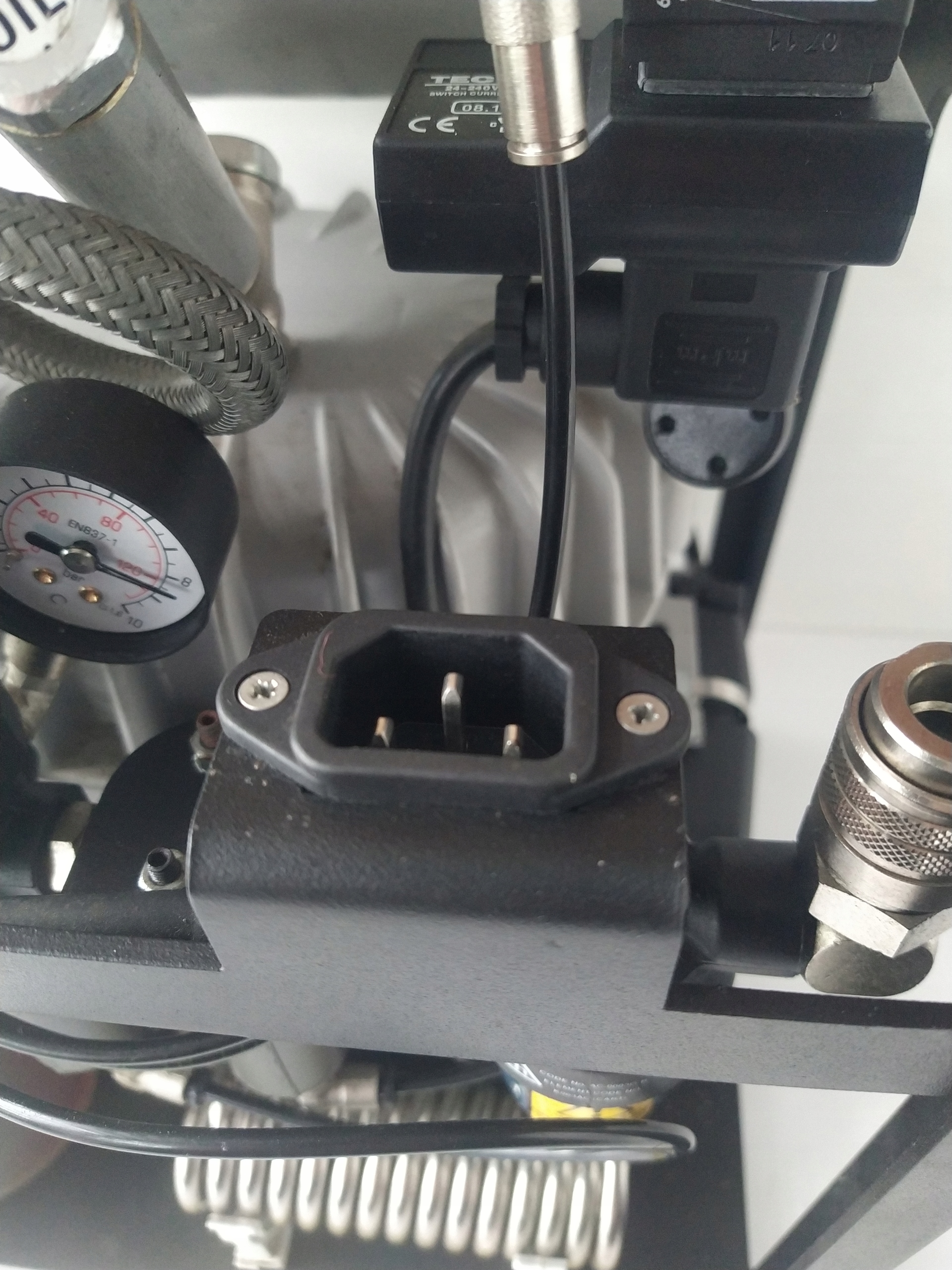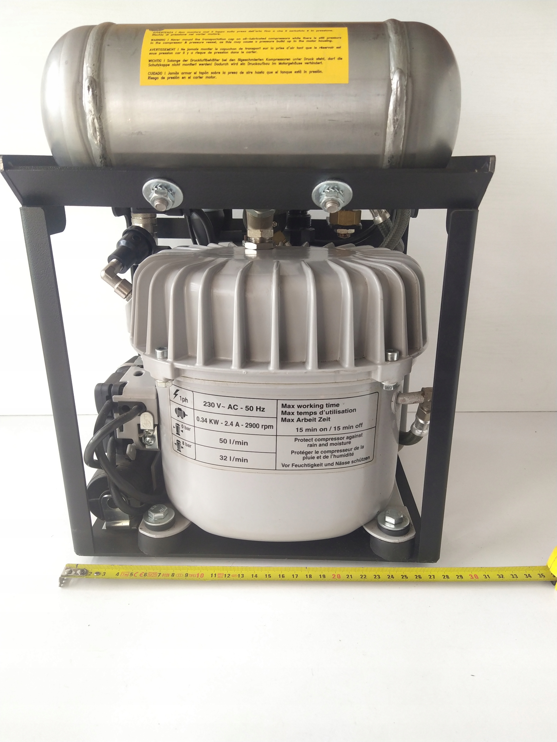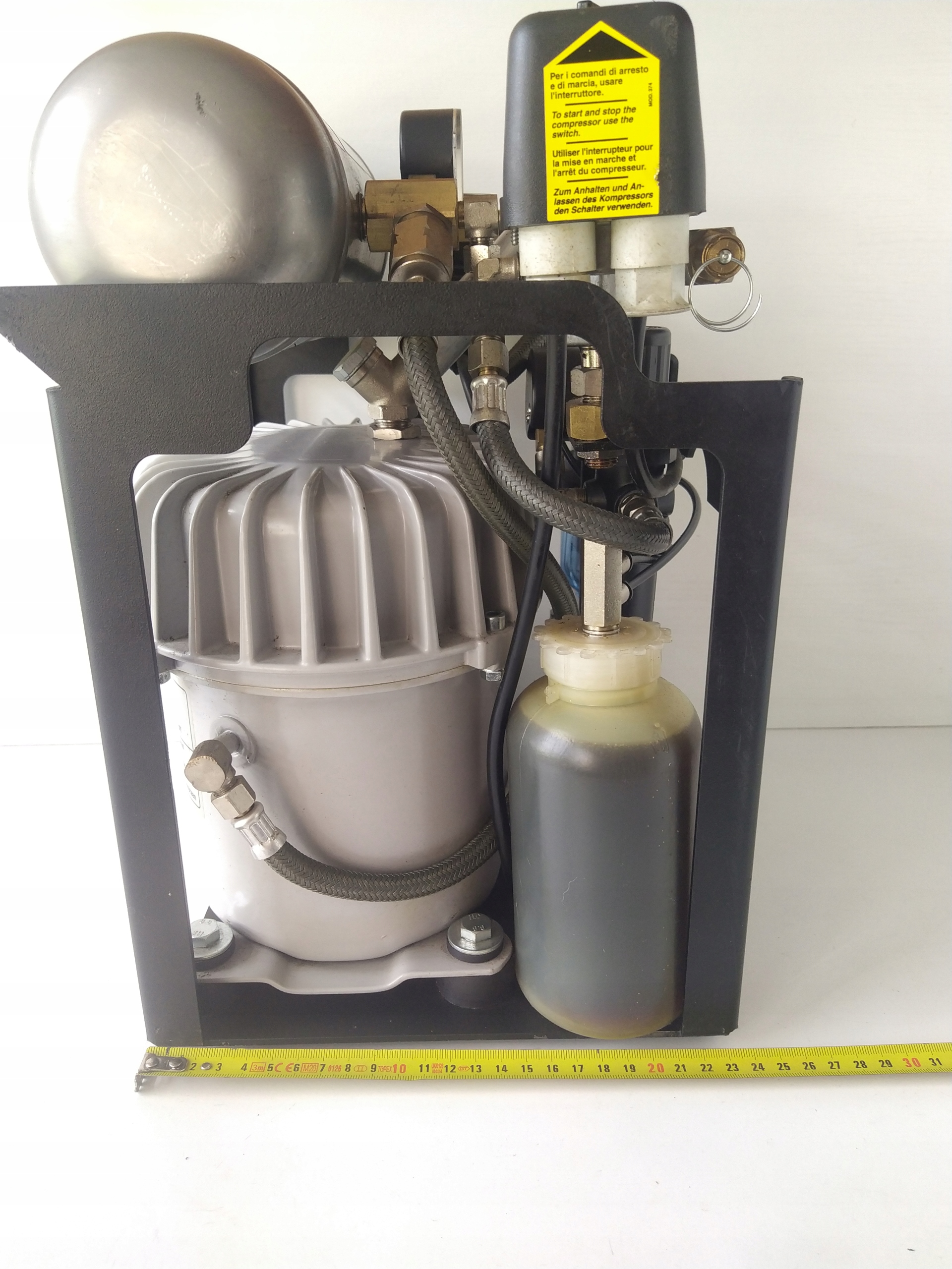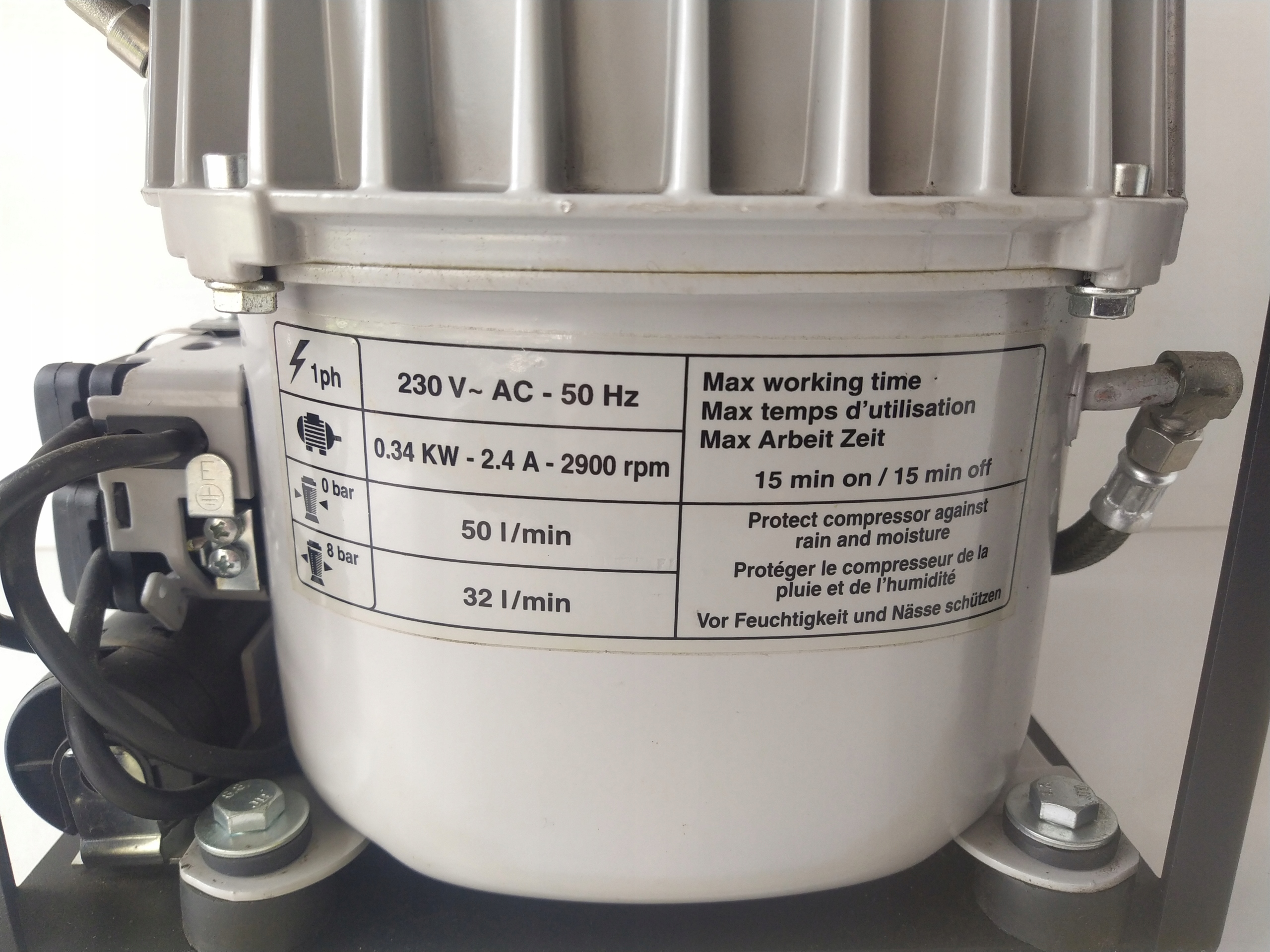 Kompresor Werther International, zasilany napięciem 230V(kabel zasilający jak do komputera), przepływ powietrza 50L/min, poziom hałasu 42dB, ciśnienie na wyjściu 8,5bar (histereza pracy 6 - 8,5bar). Kompresor jest wysokiej klasy urzadzeniem, często stosowanym w urządzeniach medycznych, ze względu na niezawodność jak i bardzo niski poziom generowanego hałasu. Urządzenie w bardzo dobrym stanie, przetestowane w pełni sprawne