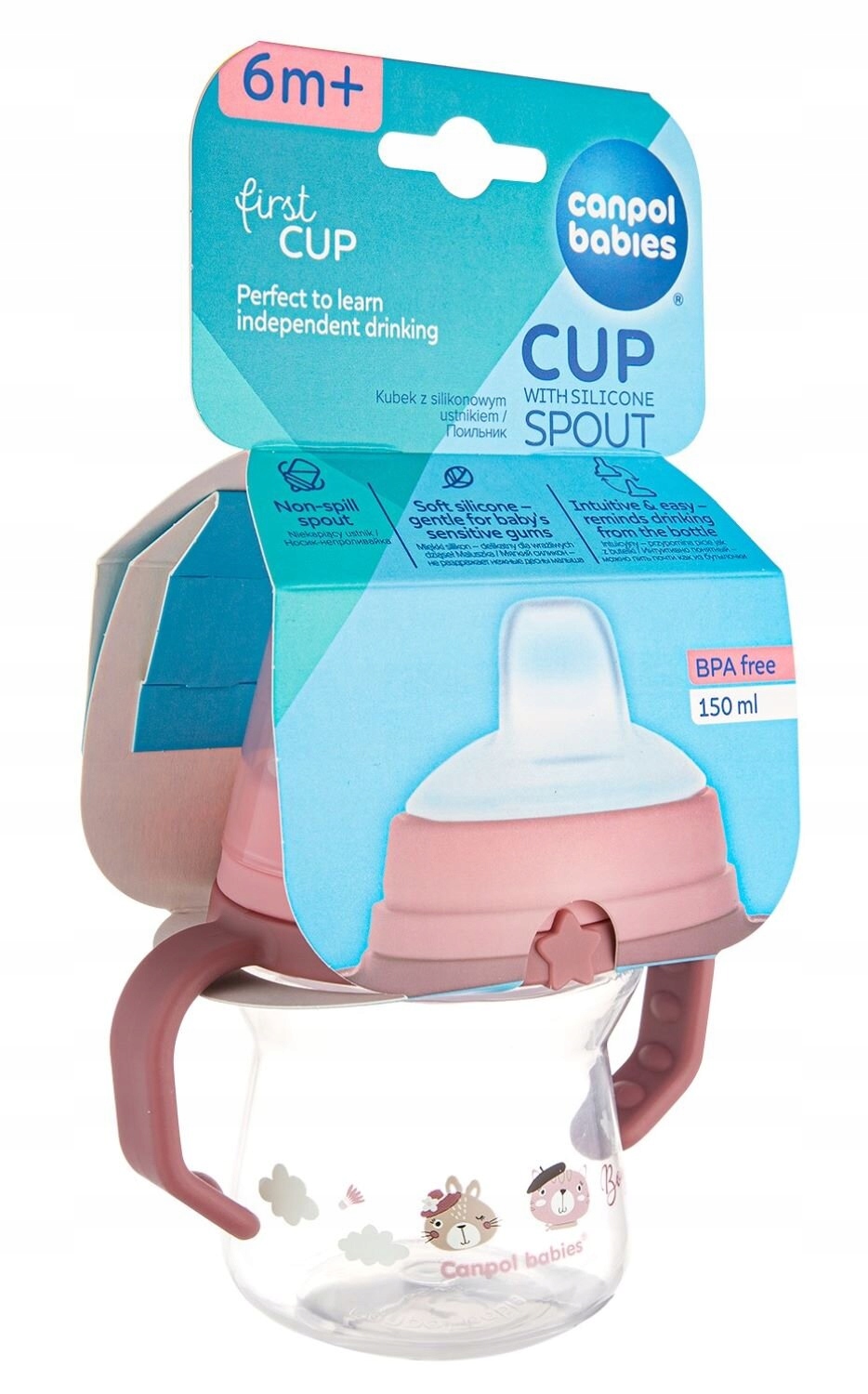 Doskonały do nauki samodzielnego picia po 6 miesiącu życia, dzięki niekapiącemu ustnikowi, który zapobiega rozlaniu. Niekapiący ustnik nie przecieka nawet, gdy dziecko przechyli czy upuści kubek. Kubek jest intuicyjny, przypomina picie z butelki, umożliwiając szybkie i łatwe przejście z butelki do kubka. Wyjątkowo miękki ustnik jest wykonany z delikatnego silikonu, bezpiecznego dla wrażliwych dziąseł dziecka. Kubek jest lekki o ergonomicznej, profilowanej budowie. Wygodne uchwyty ułatwiają dziecku trzymanie go w malutkich rączkach. Niewielka ilość elementów sprawia, że jest łatwy do składania i mycia – kubek nie ma zbędnych zakamarków, dzięki czemu można szybko umyć wszystkie części, a ustnik wyparzyć. Canpol kubek niekapek 150 ml z silikonowym ustnikiem jest transparentny, co pozwala kontrolować ilości przyjmowanych płynów przez dziecko. Różowy kubek niekapek Canpol babies 150 ml FirstCup BONJOUR PARIS posiada szczelną osłonkę, która chroni ustnik przed zabrudzeniem.