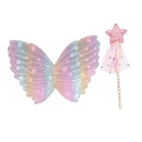 Opalizujące, kolorowe skrzydełka dla dziecka, w komplecie z różdżką. Skrzydełka posiadają elastyczne gumki umożliwiające komfortowe założenie oraz noszenie skrzydełek. Skrzydełka efektownie się mienią i doskonale komponują z błyszczącą różdżką. Różdżka zakończona została brokatową gwiazdką, od której ku dołowi odchodzą elementy dekoracyjne. Zestaw doskonale pasuje do przebrań wróżki czy magicznego jednorożca. Doskonały na sesje zdjęciowe, zabawy, bale przebierańców. Wymiary skrzydełek: 35x20 cm.