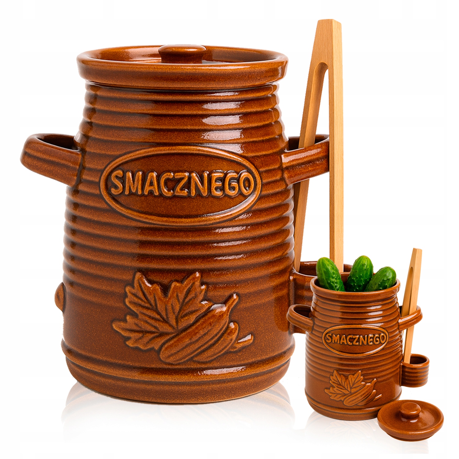 ✅ Brązowa kamionka z tłoczonym napisem "smacznego" | 🧄 Idealny do kiszenia i pieczenia | 🪵 Drewniane szczypce w komplecie