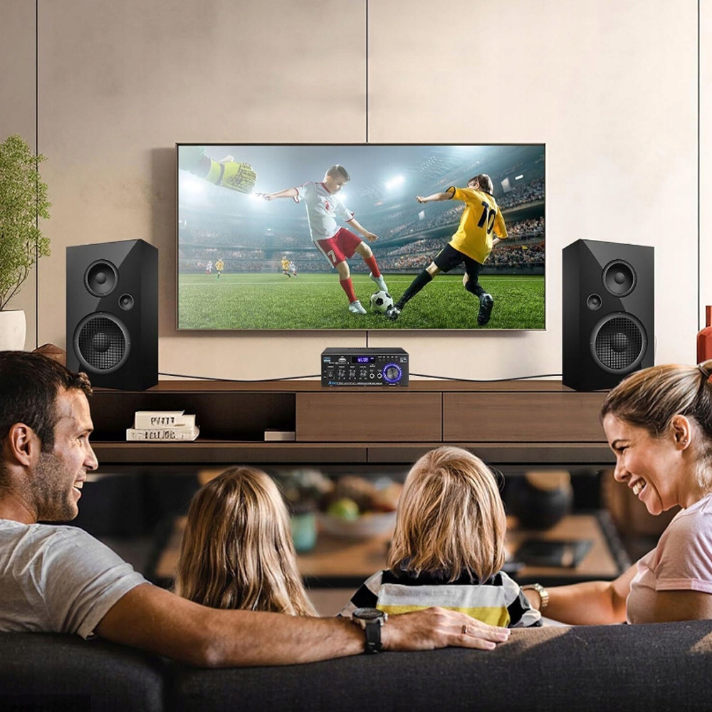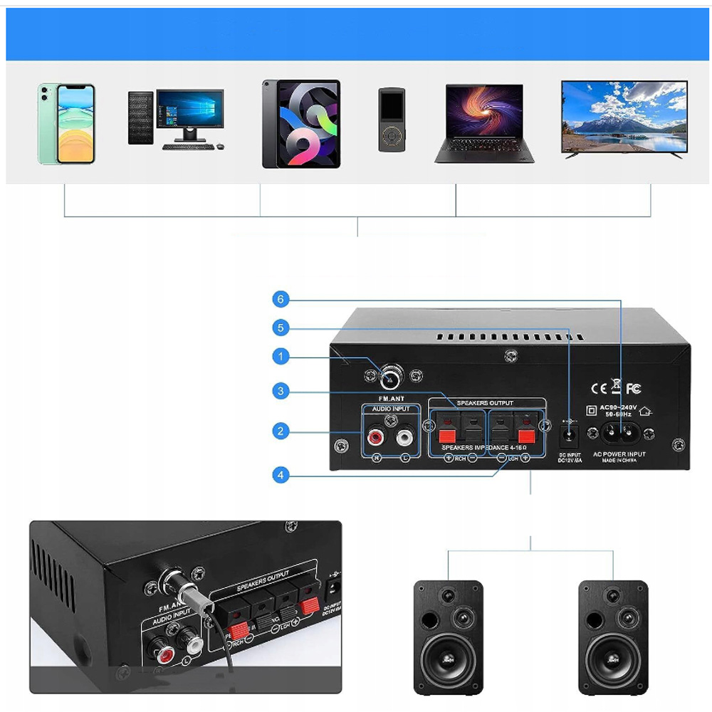Ten domowy wzmacniacz mocy audio, z wejściem Bluetooth, AUX, MIC, SD, USB, audio z urządzeń zewnętrznych, takich jak CD, DVD, TV, PC, komputery, tablety, notebooki, telefony, MP3 i projektory z AV audio itp., mini wzmacniacz z funkcją FM, świetny do użytku w pomieszczeniach / na zewnątrz, na imprezach, w samochodzie, do nauczania.