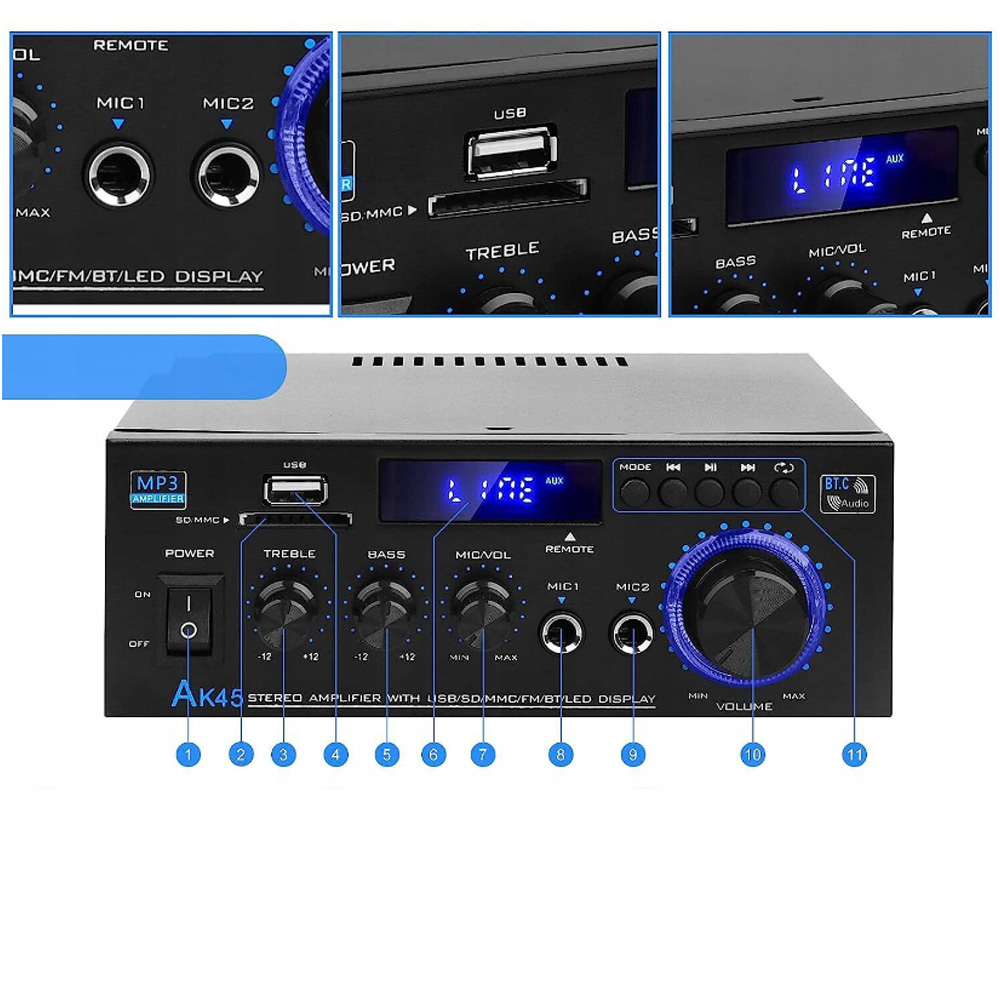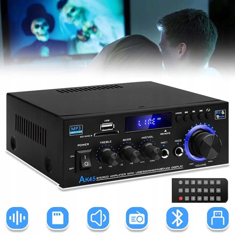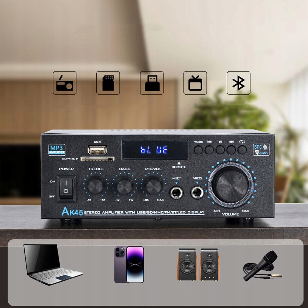 Ten domowy wzmacniacz audio AK45 ma wbudowany układ Bluetooth 5.0, obsługuje bezprzewodowe połączenie między urządzeniami audio i wzmacniaczami, zapewnia bezstratną jakość dźwięku i wygodę. Mini wzmacniacz mocy z pilotem zdalnego sterowania do regulacji dźwięku na odległość, można przełączać 6 różnych efektów korekcji wbudowanych w odtwarzacz. Łatwa w użyciu wtyczka amerykańska, doskonała do systemów kina domowego.