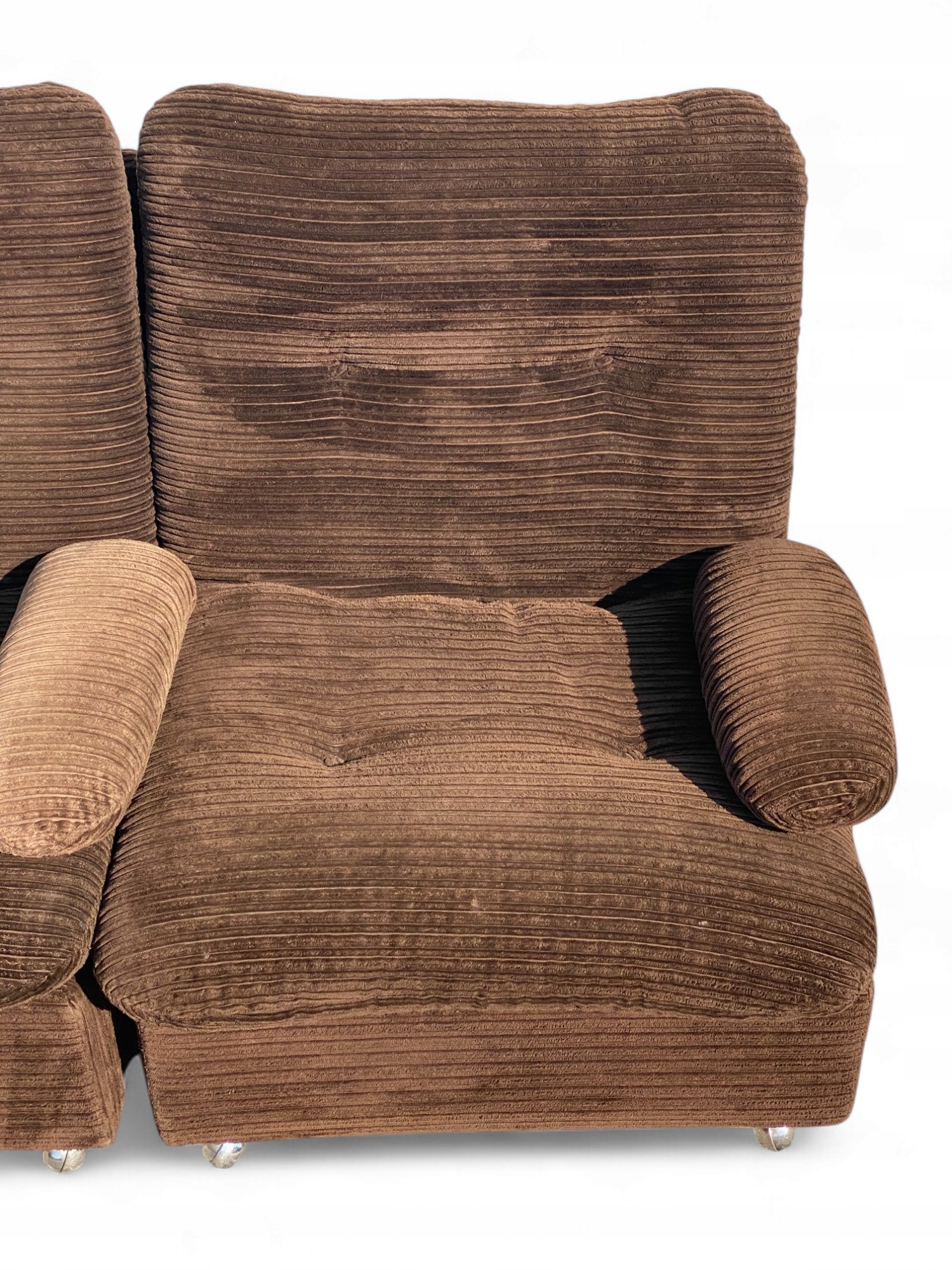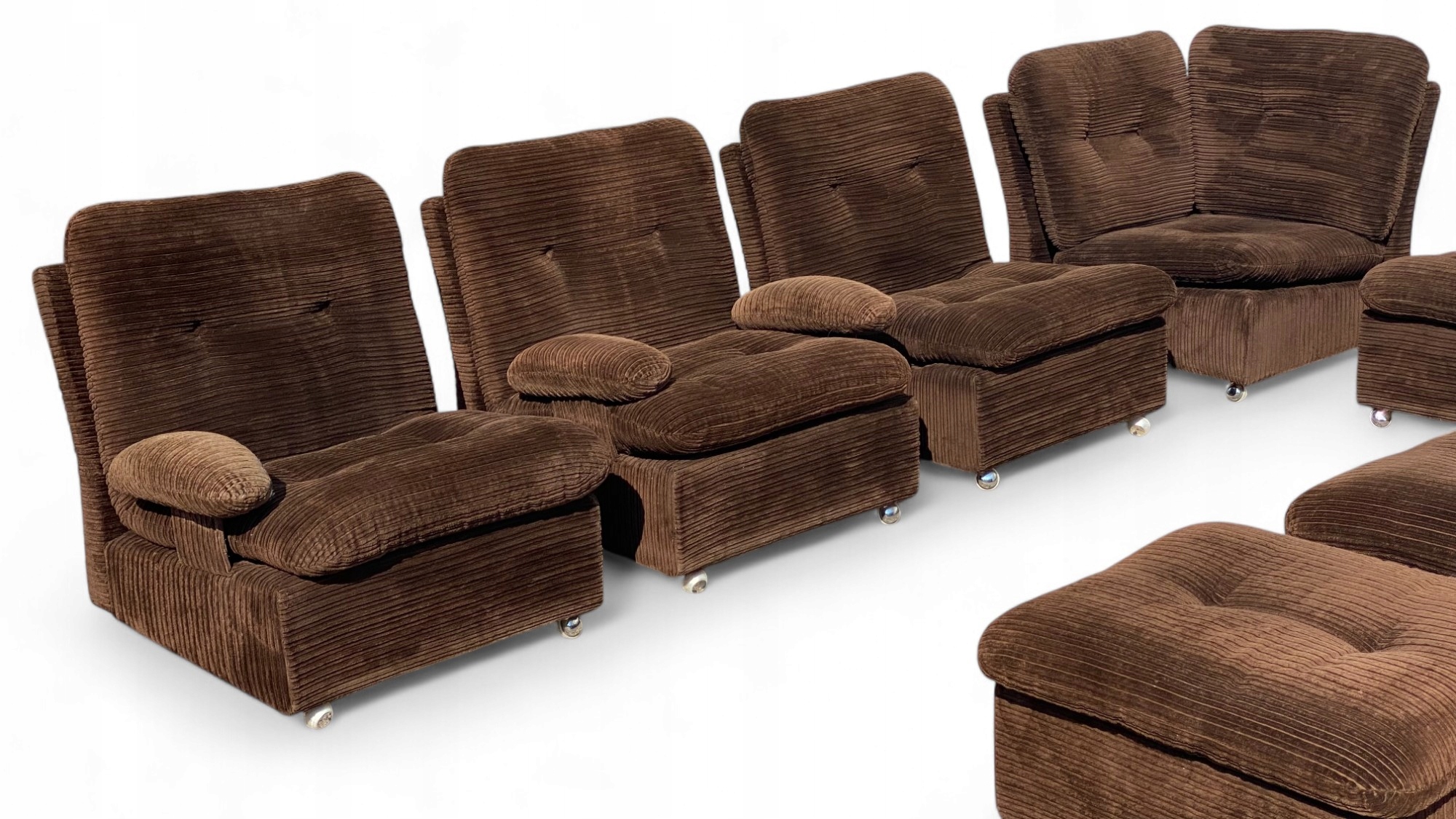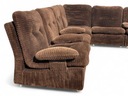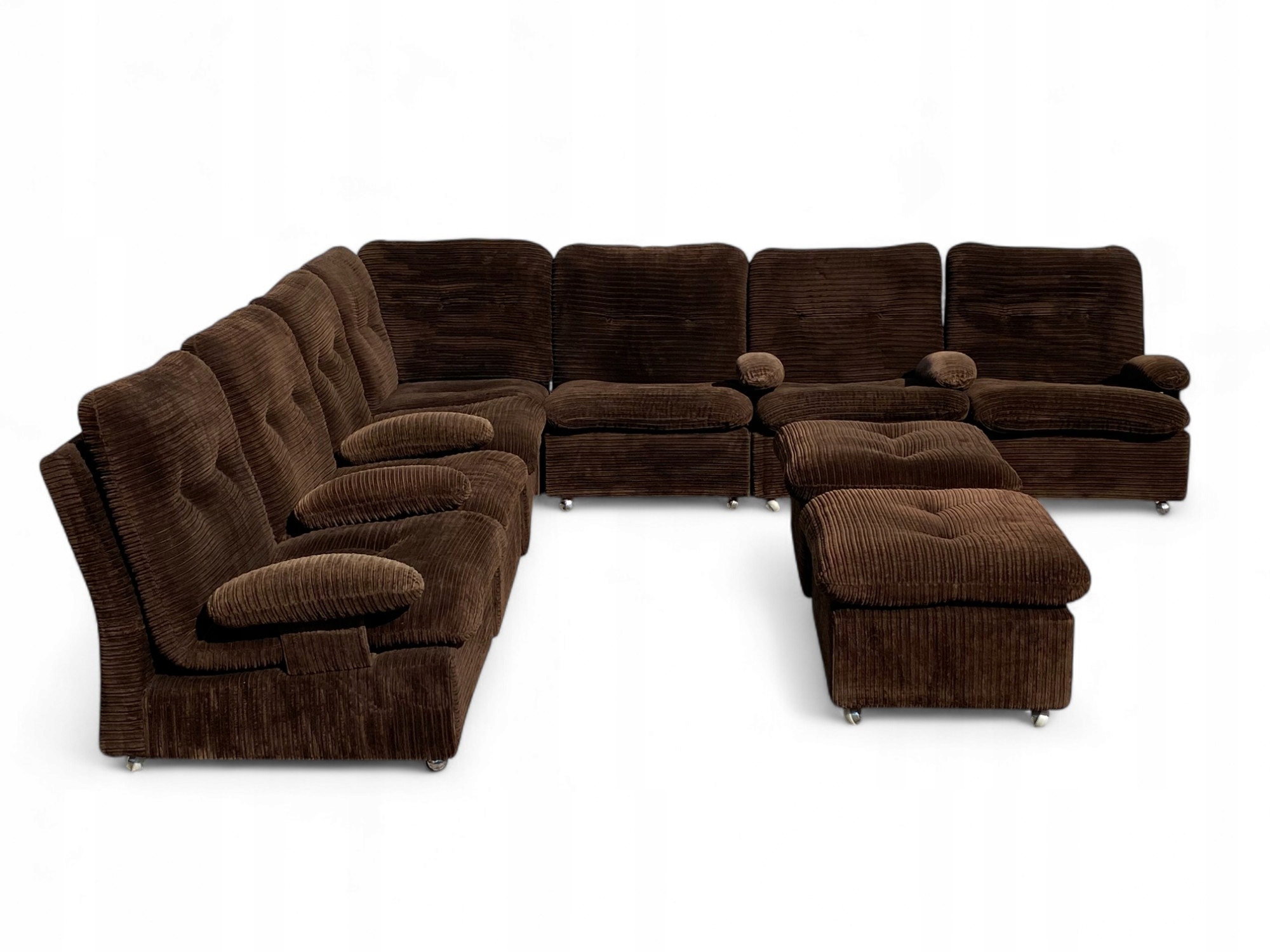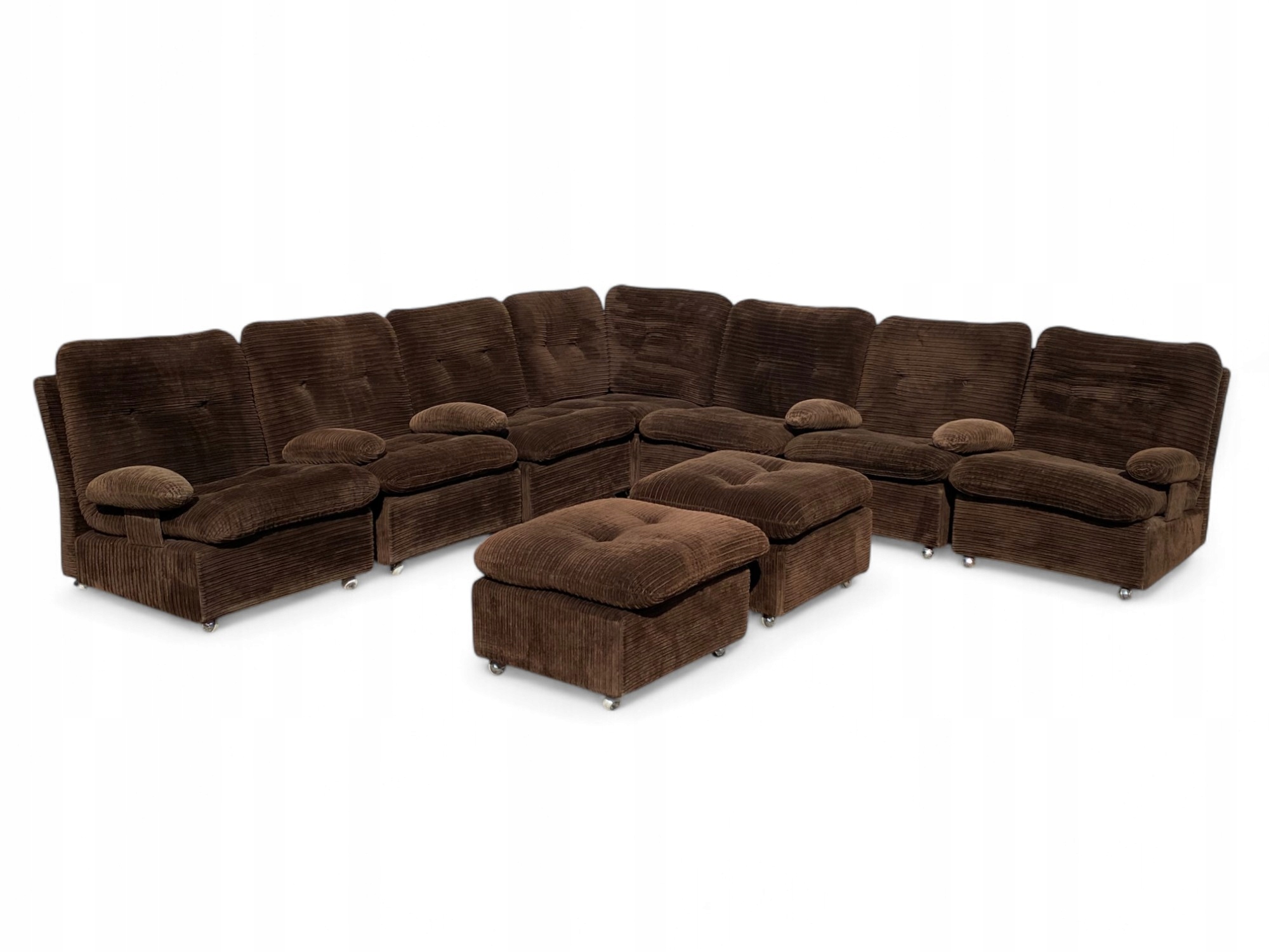 Oferujemy wyjątkowy, modułowy narożnik wypoczynkowy pochodzący z lat 70. XX wieku, obszyty miękkim, grubym sztruksem w ciepłym brązowym odcieniu.