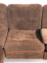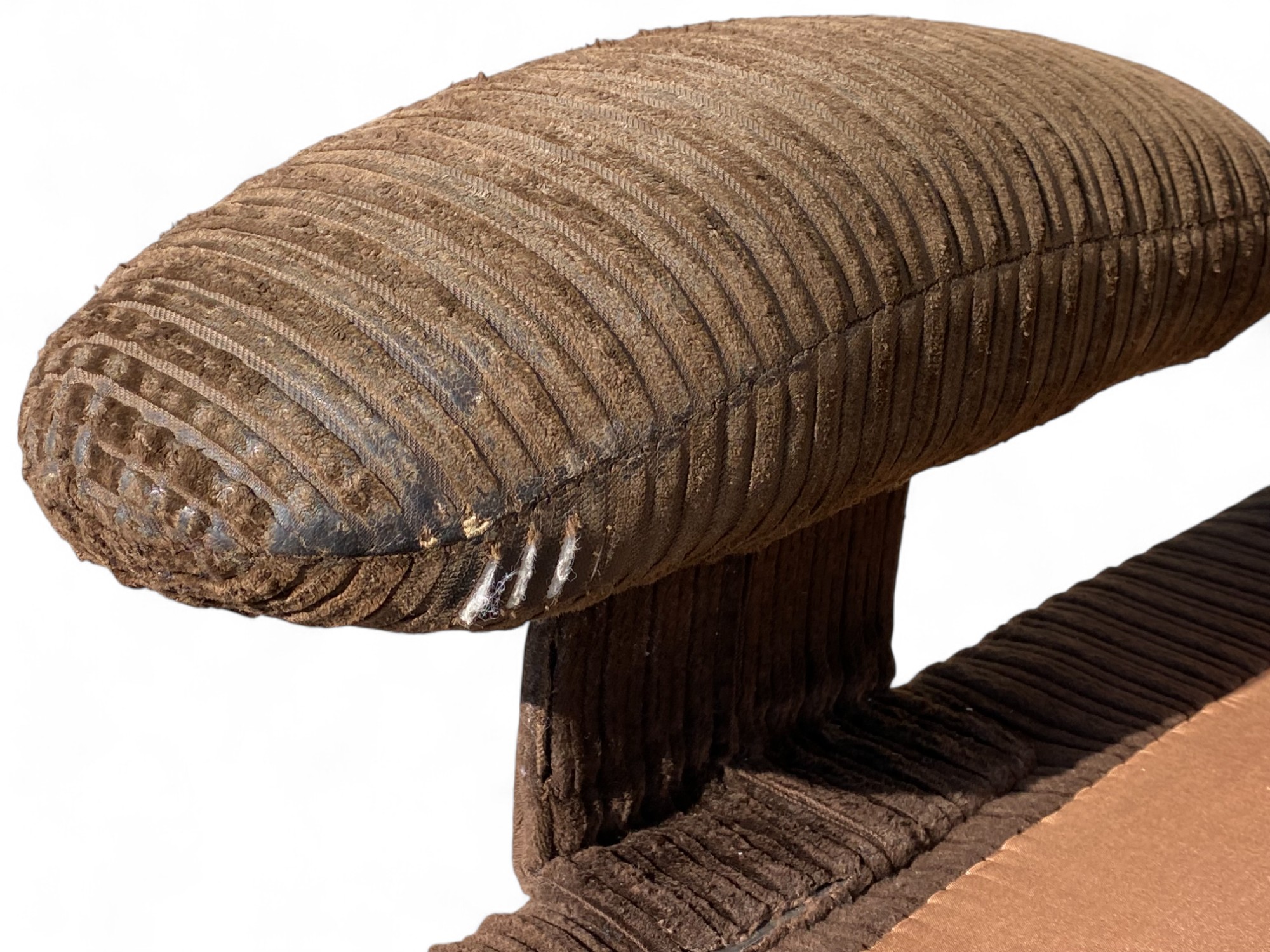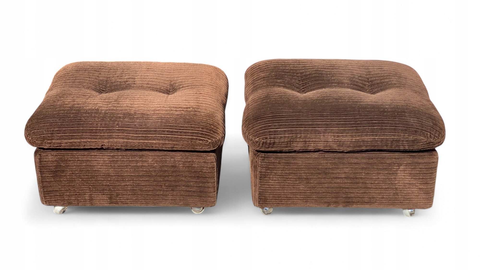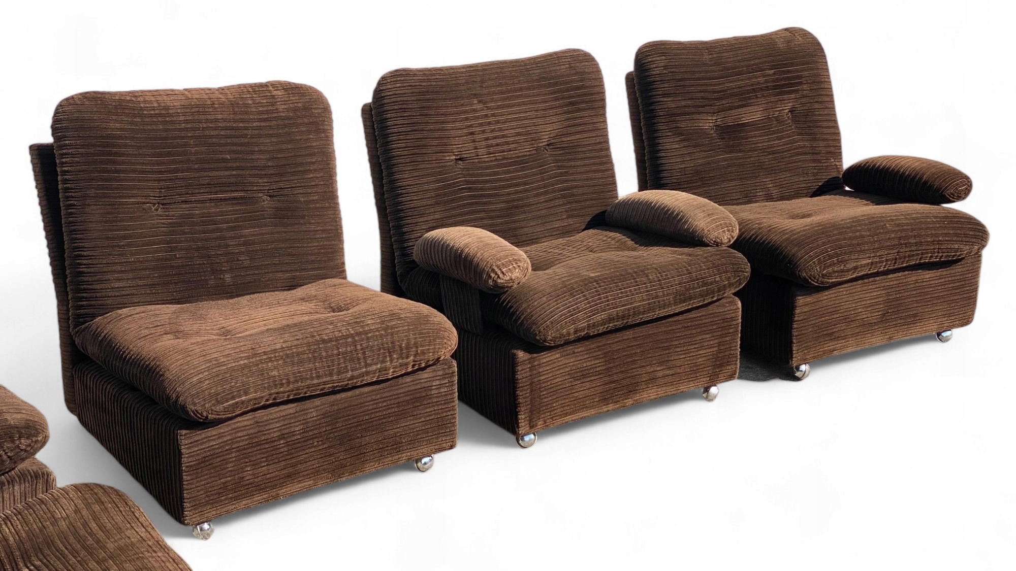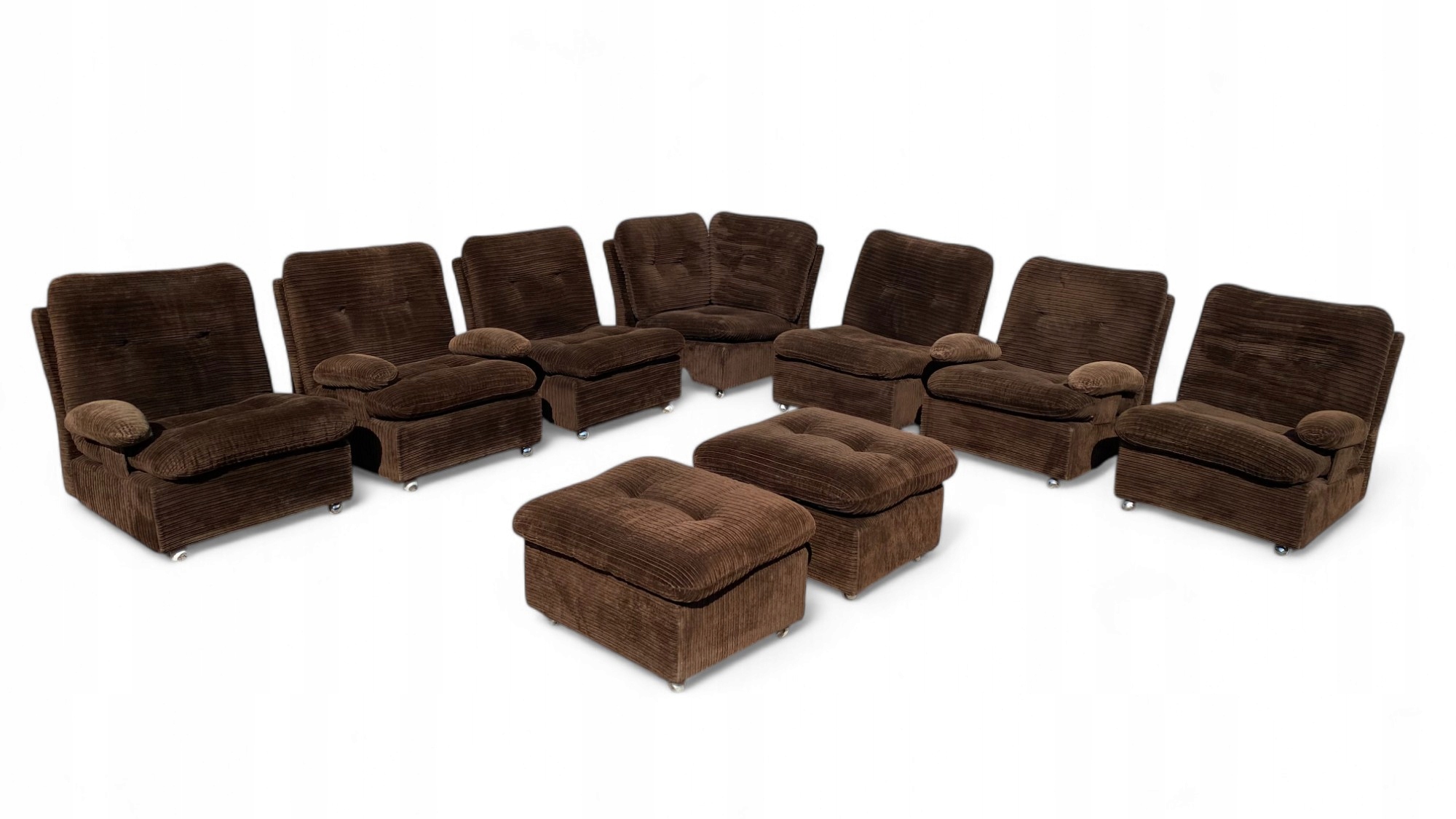 Oferujemy wyjątkowy, modułowy narożnik wypoczynkowy pochodzący z lat 70. XX wieku, obszyty miękkim, grubym sztruksem w ciepłym brązowym odcieniu.