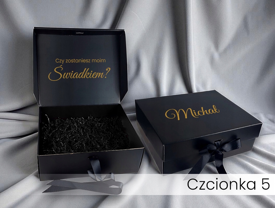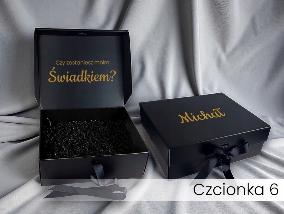 Pudełka wypełniamy standardowo wiórkami w kolorze czarnym. Jeżeli życzycie sobie wypełnienie w innym kolorze prosimy poinformować nas o zmianie w uwagach podczas składania zamówienia.