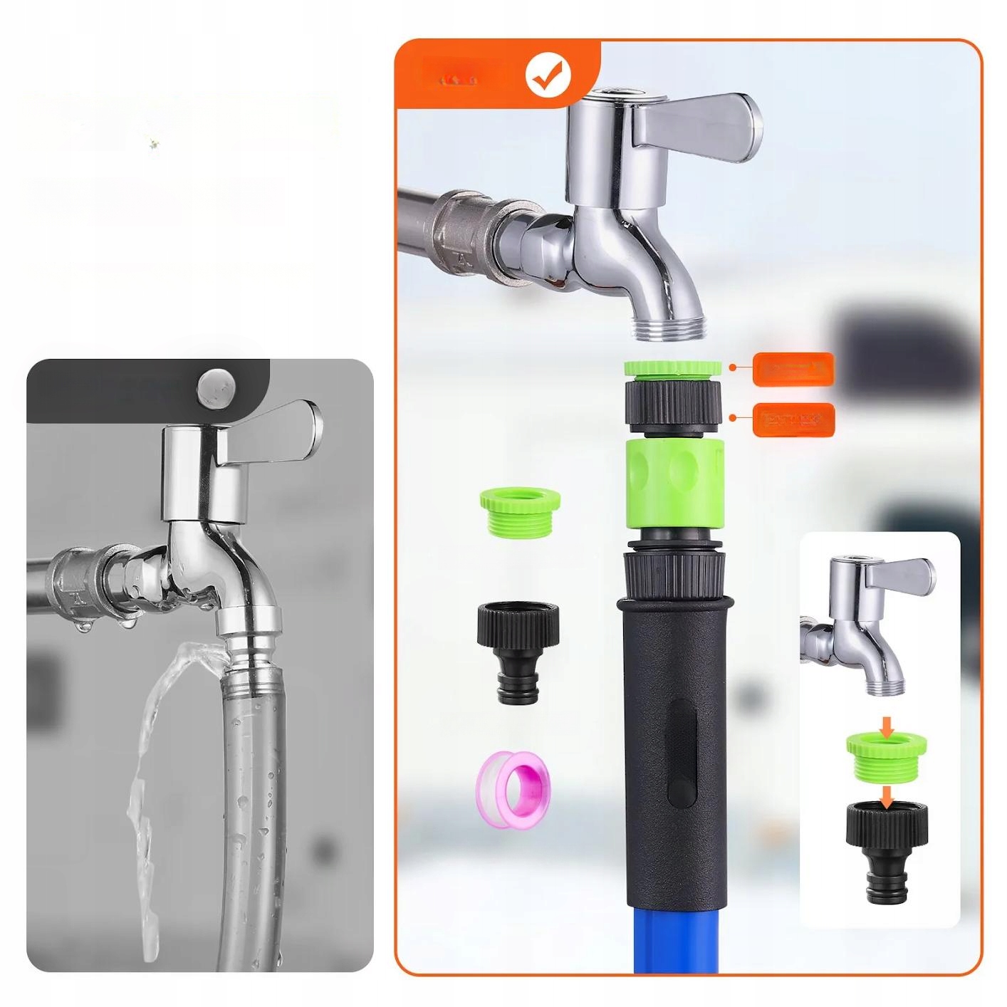 Adapter żeński G1/2", złącze męskie G3/4", taśma uszczelniająca do gwintów. W zestawie zestaw końcówek umożliwiających łatwe podłączenie i szybkie dopasowanie do różnych systemów.