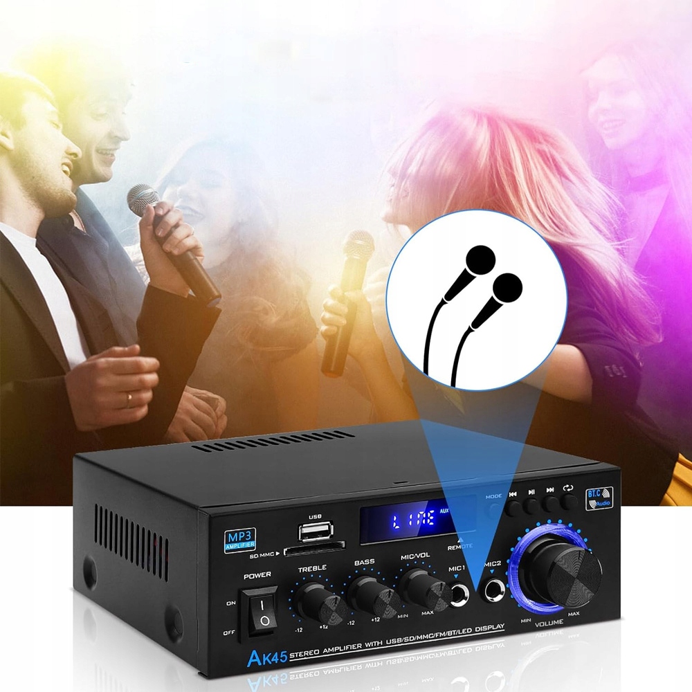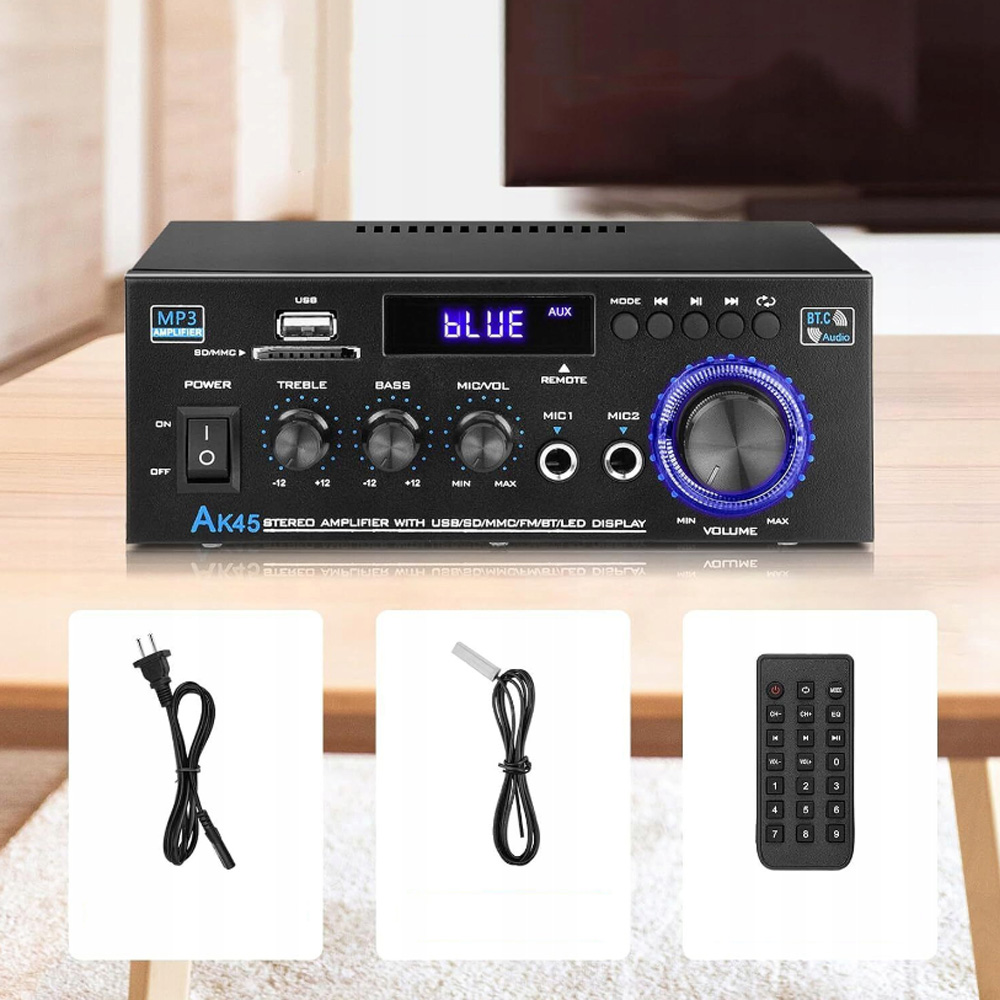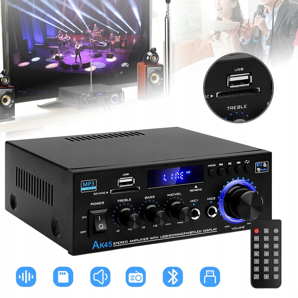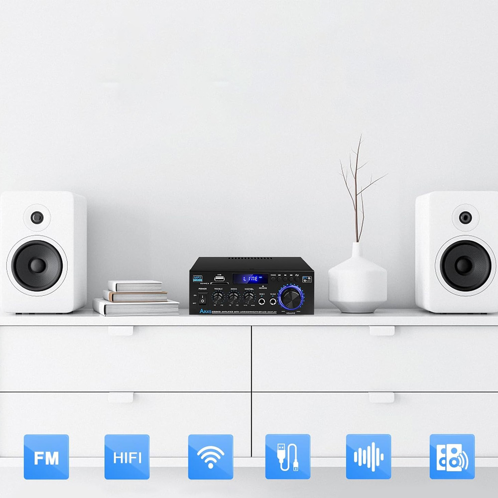 Ten domowy wzmacniacz audio AK45 ma wbudowany układ Bluetooth 5.0, obsługuje bezprzewodowe połączenie między urządzeniami audio i wzmacniaczami, zapewnia bezstratną jakość dźwięku i wygodę. Mini wzmacniacz mocy z pilotem zdalnego sterowania do regulacji dźwięku na odległość, można przełączać 6 różnych efektów korekcji wbudowanych w odtwarzacz. Łatwa w użyciu wtyczka amerykańska, doskonała do systemów kina domowego.