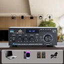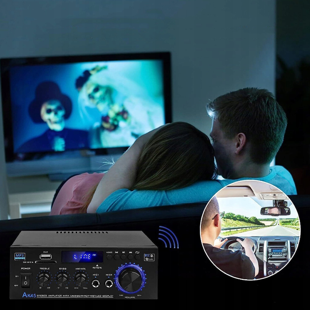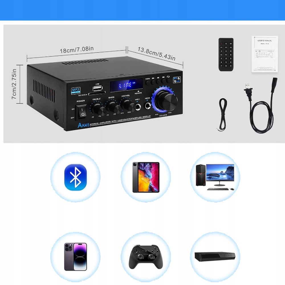 Ten domowy wzmacniacz mocy audio, z wejściem Bluetooth, AUX, MIC, SD, USB, audio z urządzeń zewnętrznych, takich jak CD, DVD, TV, PC, komputery, tablety, notebooki, telefony, MP3 i projektory z AV audio itp., mini wzmacniacz z funkcją FM, świetny do użytku w pomieszczeniach / na zewnątrz, na imprezach, w samochodzie, do nauczania.