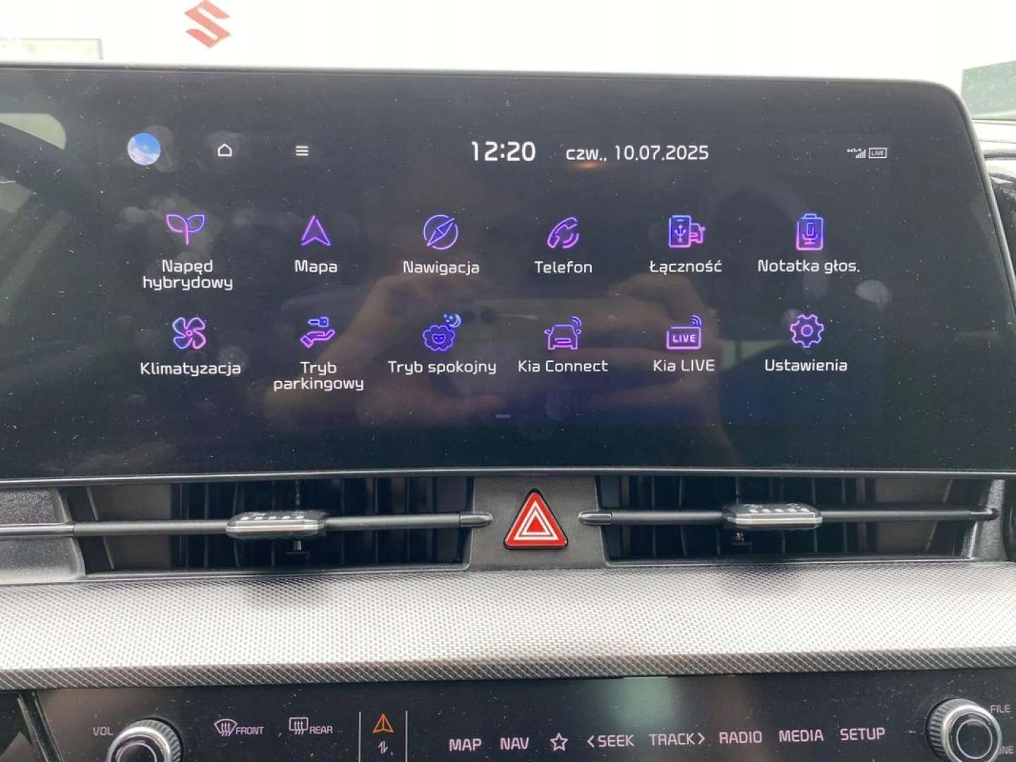 - 12,3-calowy centralny ekran nawigacji satelitarnej, radio DAB, usługi cyfrowe Kia Connect, dwa porty USB-C w oparciach przednich foteli