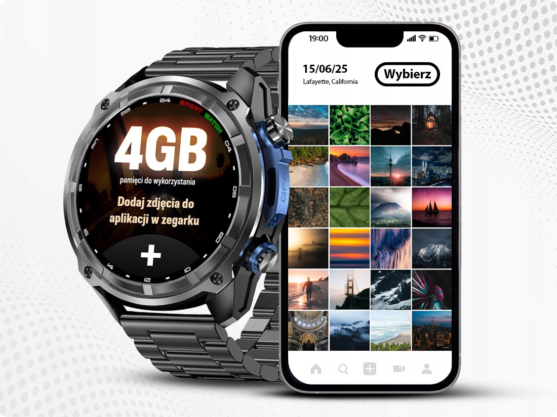 Dzięki pamięci 4GB smartwatch może przechowywać pliki muzyczne, które można odtwarzać przez sparowane słuchawki, idealne do biegania czy treningu.