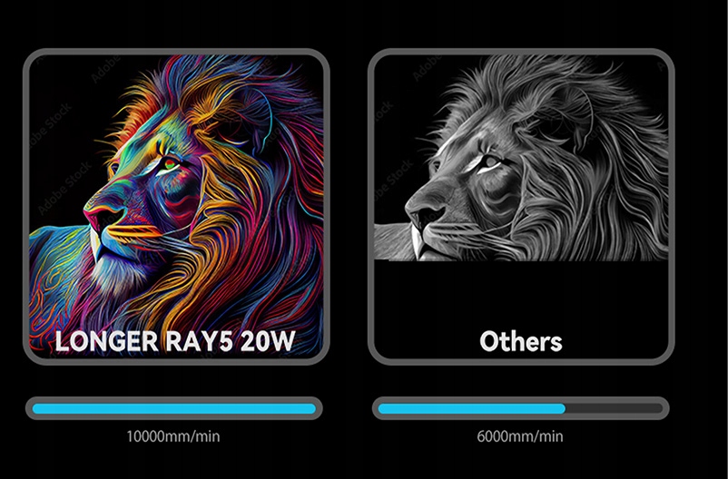 Grawerka LONGER RAY5 20W może grawerować z prędkością do 10 000 mm/min. Prawie 3 razy szybciej niż zwykłe maszyny grawerujące. Oszczędzaj cenny czas, szybko generując grawerowany produkt.
