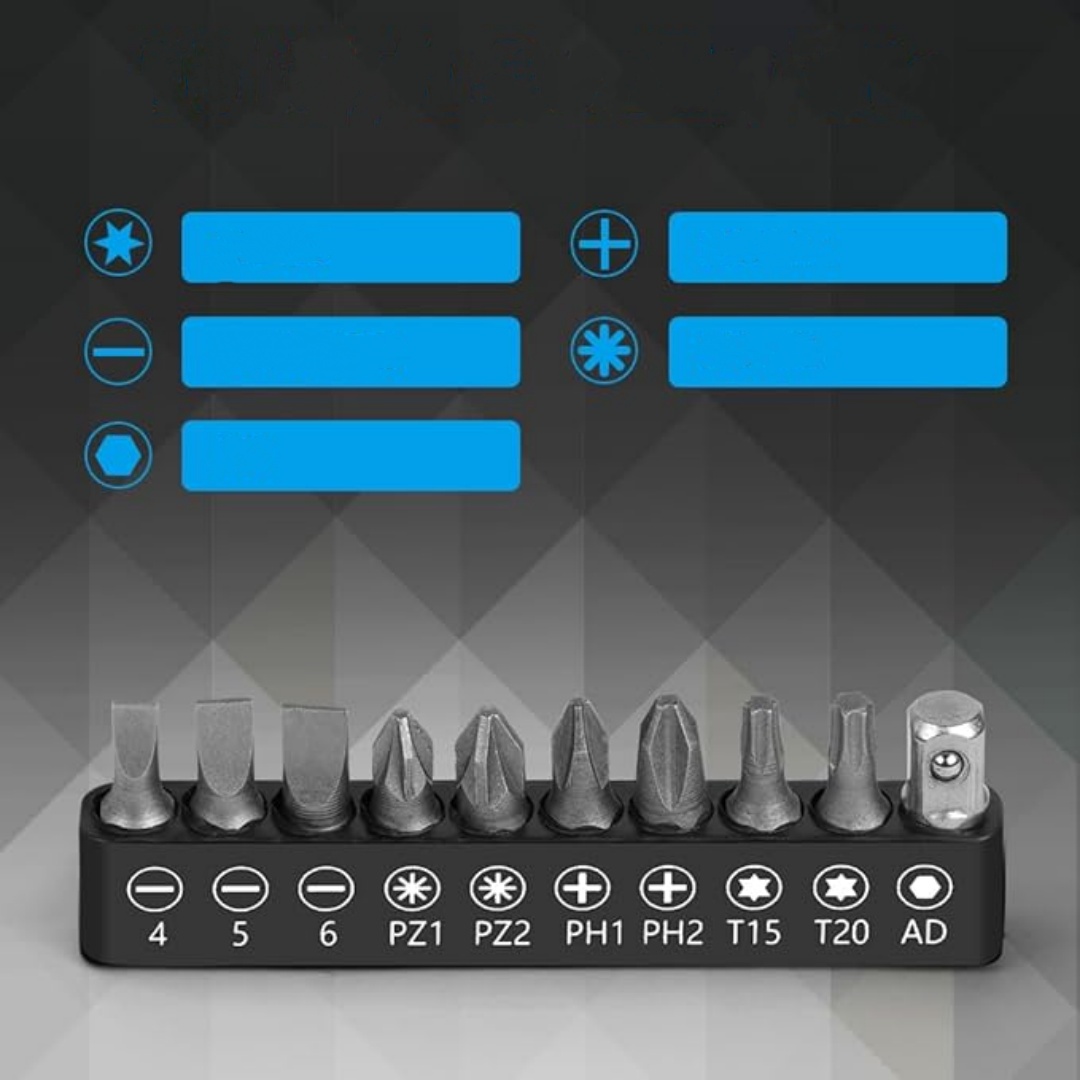 Jeden klucz + 10 głowic wsadowych + 9 nasadek + 1 przedłużka wkrętaka.