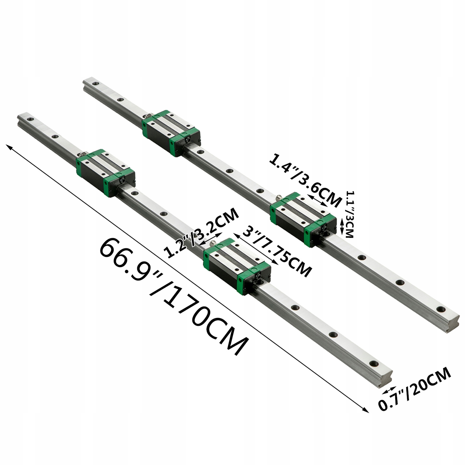 Zestaw prowadnicy liniowej i łożysk zawiera 2 sztuki wału szynowego HSR20 o długości 66,9 cala / 1700 mm, 4 bloki HSR20 i kilka zatyczek pyłoszczelnych.