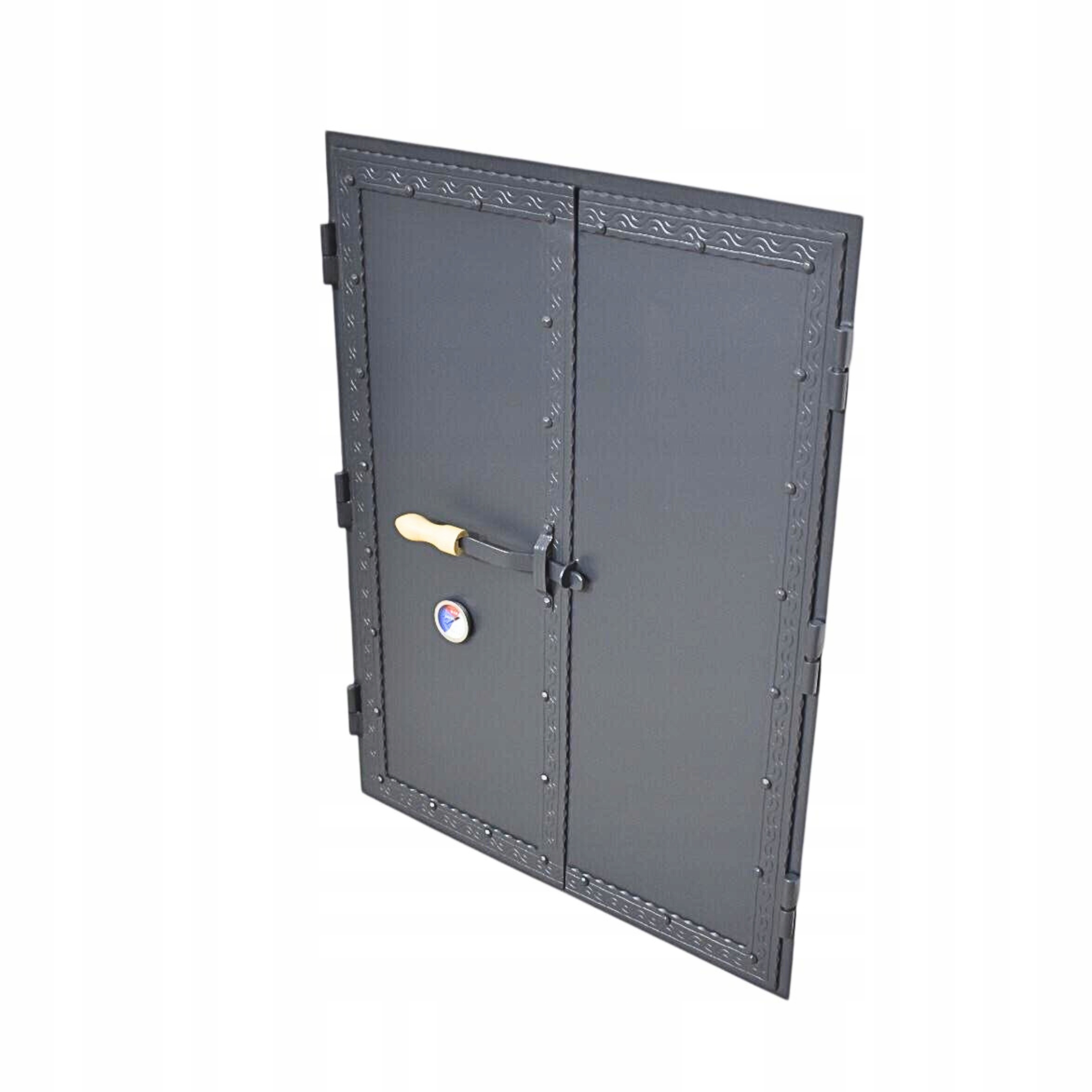 Stalowe drzwi do wędzarni z ozdobnymi przetłoczeniami – 600 × 800 mm z termometrem.