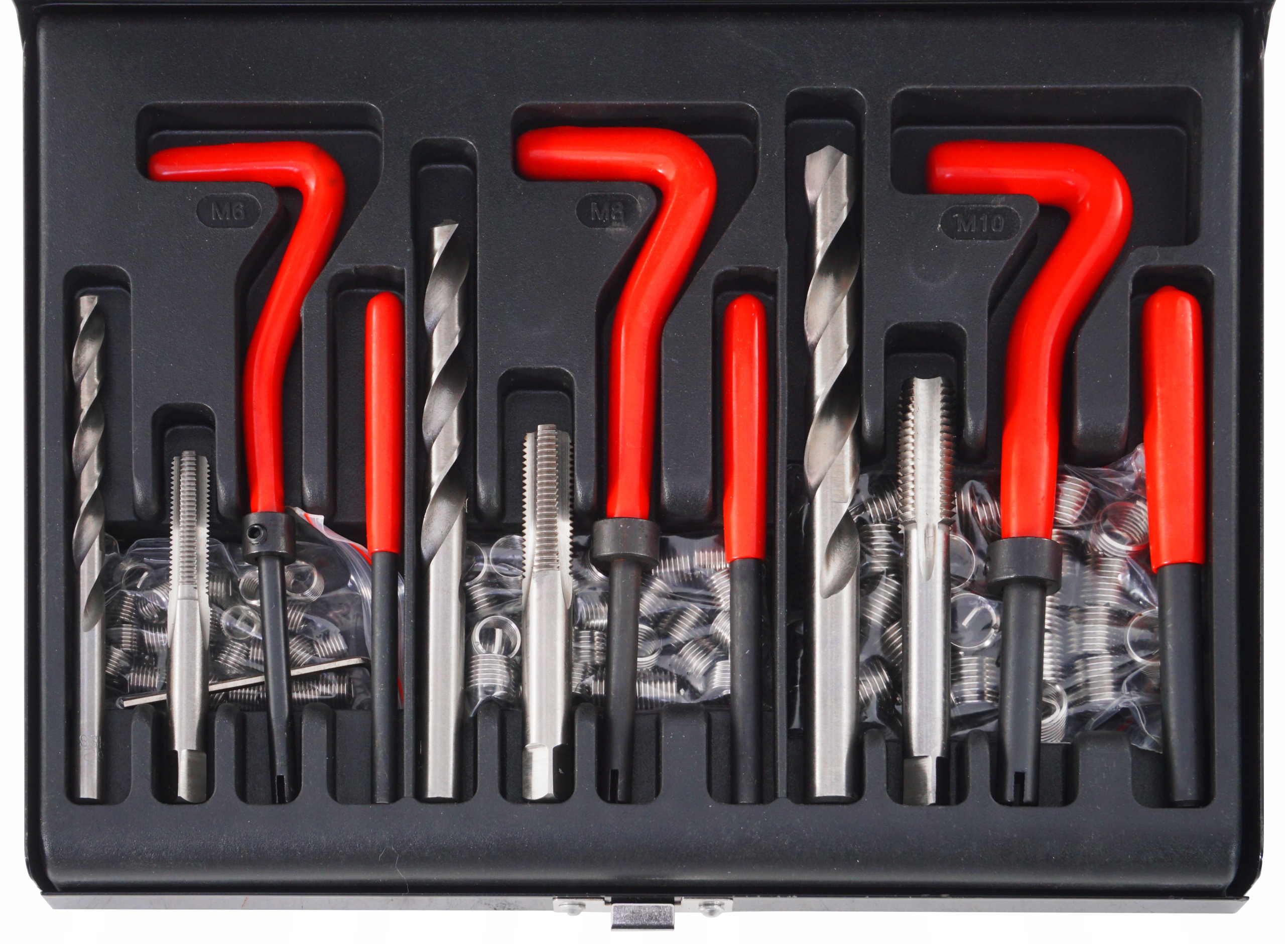 Zestaw pozwala na naprawę trzech popularnych rozmiarów gwintów: M6 x 1.0 x 8,0 mm, M8 x 1.25 x 10.8 mm oraz M10 x 1.5 x 13.5 mm. Dzięki temu jeden zestaw wystarczy do naprawy wielu standardowych elementów.
