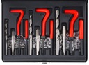Wysokiej jakości gwintowniki i wiertła umożliwiają precyzyjne nacinanie gwintów, a pokrętło prowadzące i wybijak gwarantują pewny montaż wkładki w miejscu naprawy.