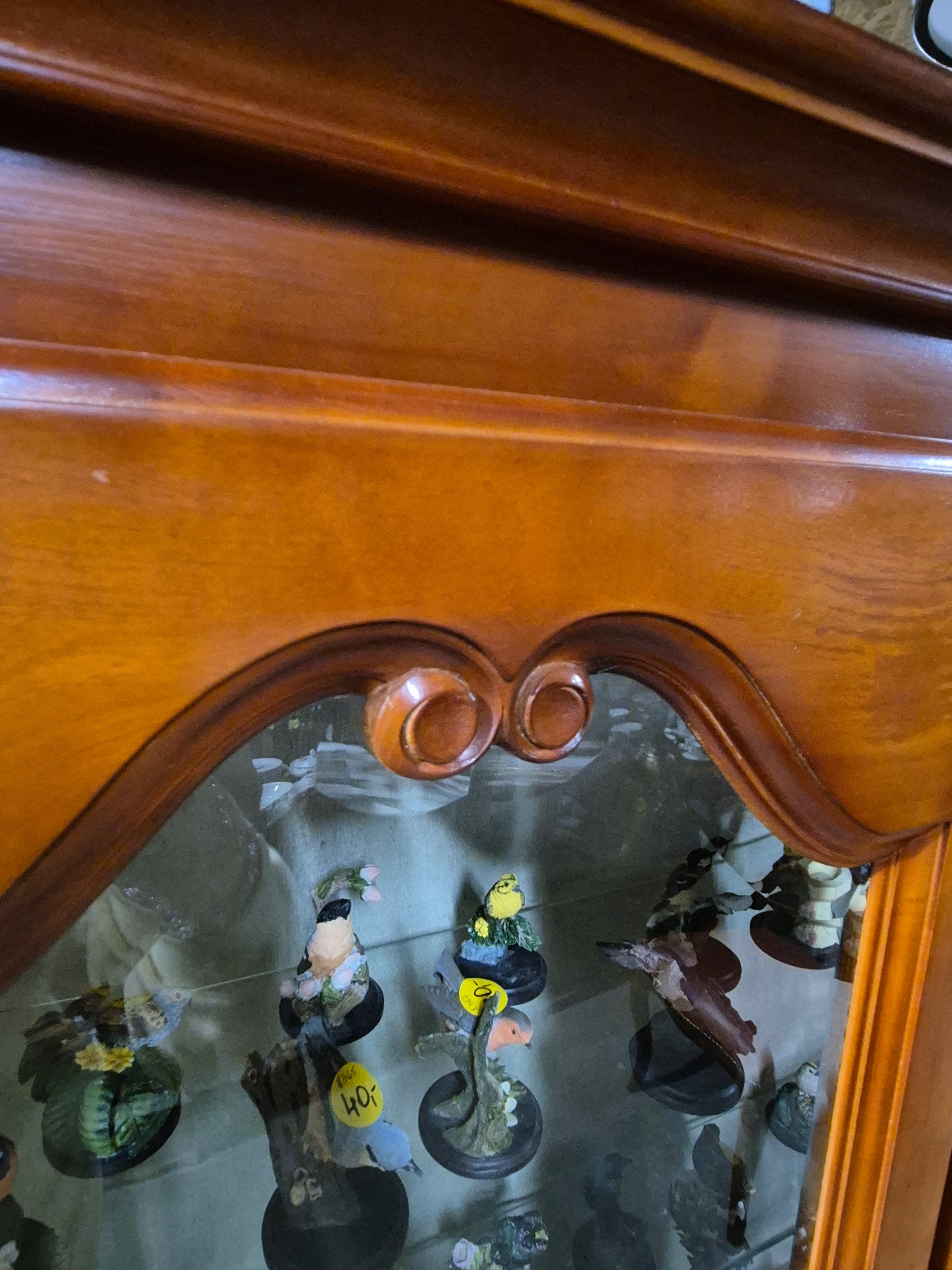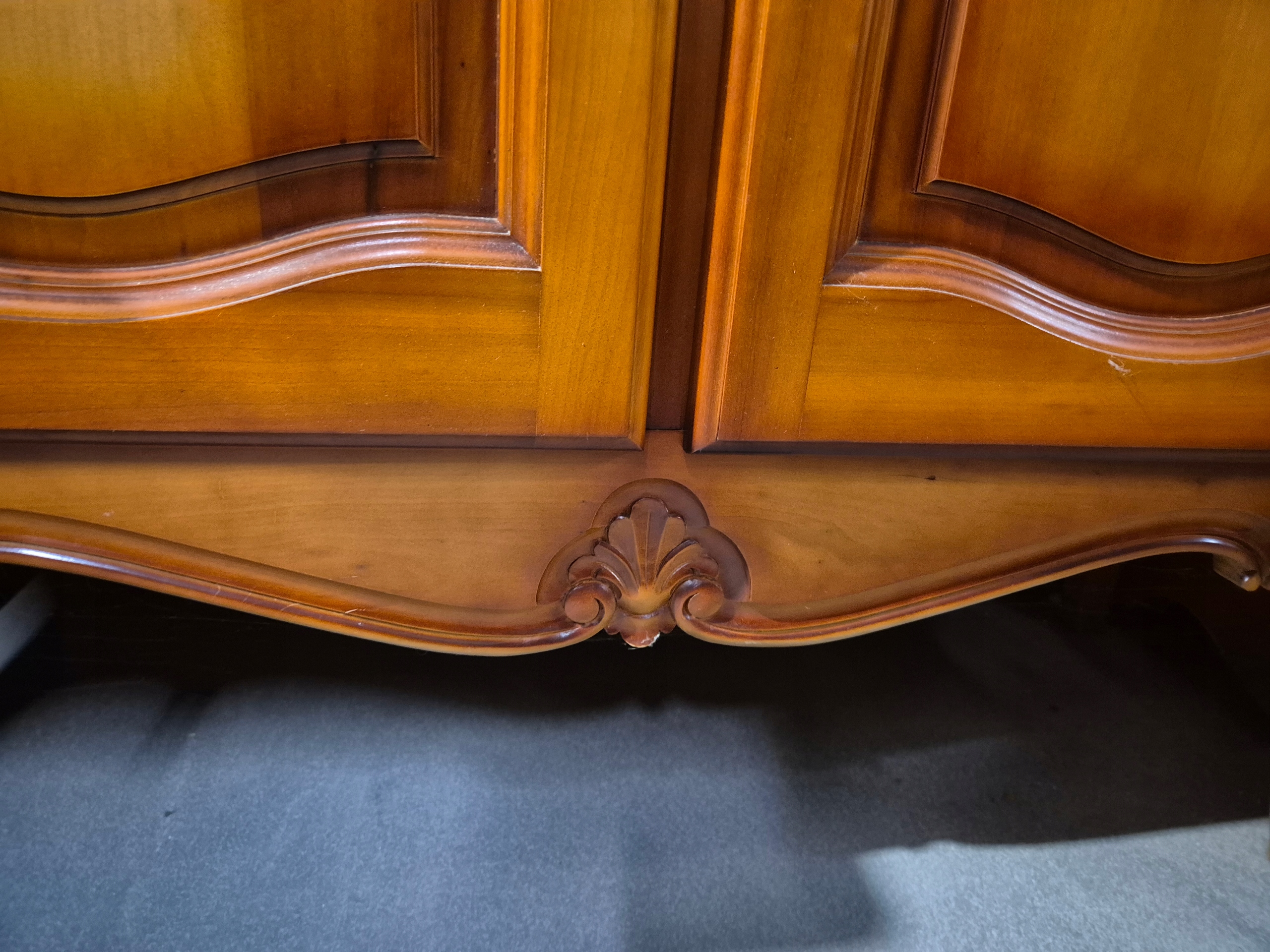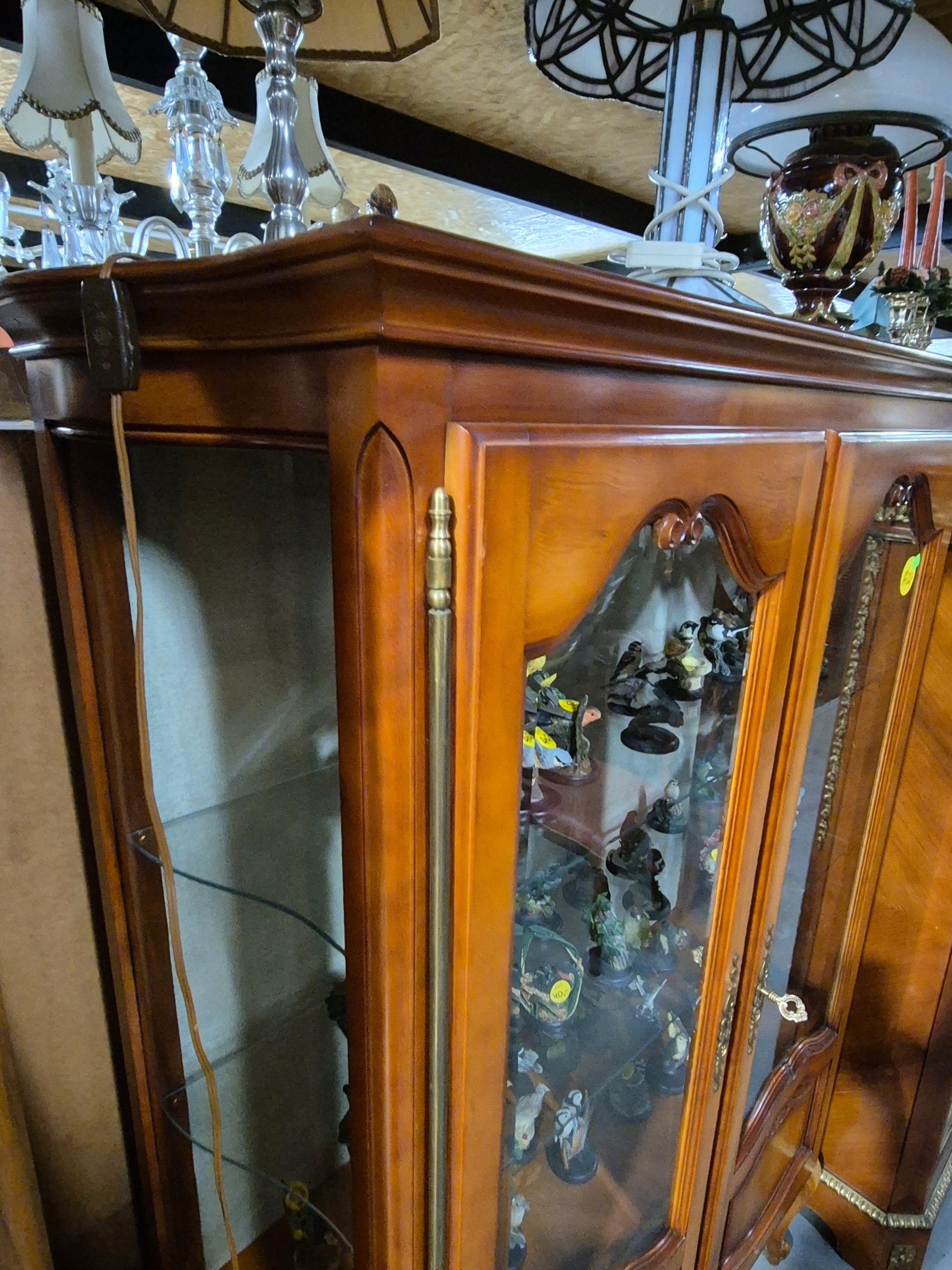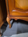 Klasyczna dwudrzwiowa witryna wykonana z drewna, na giętych nóżkach. Front przeszklony, w środku półki szklane – idealna do ekspozycji porcelany, szkła czy kolekcji. Stylowe zdobienia dodają meblowi uroku i elegancji.
