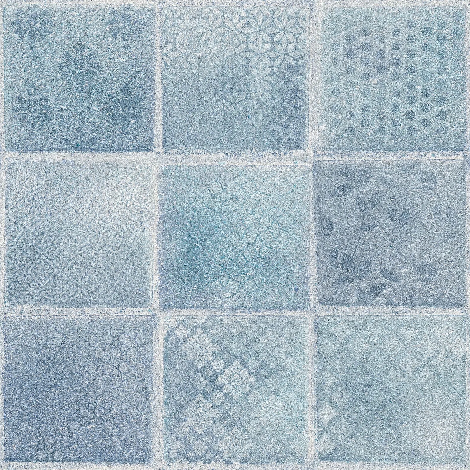 Nowoczesna tapeta przedstawiająca betonowo płytki, zdobione kafle w kolorze niebieskim która daje efekt modnych portugalskich płytek