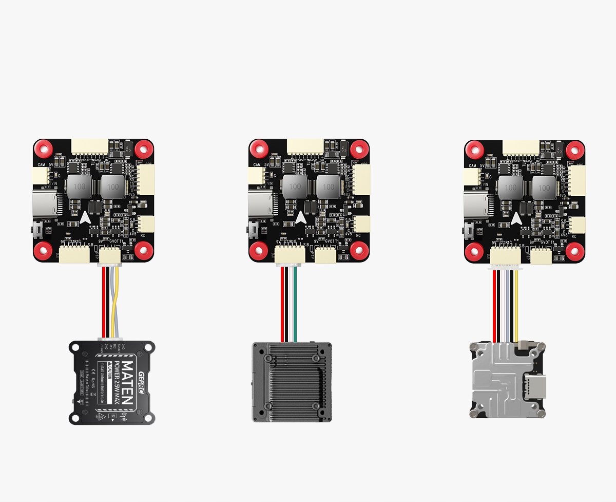 Optymalizacja zasilania Izolowany układ 4,5V/5V* zapobiega uszkodzeniom urządzenia spowodowanym przeciążeniem prądu podczas regulacji parametrów; Programowalny przełącznik BEC 9V umożliwia elastyczne sterowanie mocą transmisji wideo*. *Zintegrowany wielokanałowy BEC: wyjścia 3,3V/300mA, 5V/3A oraz 9V/3A obsługują urządzenia zewnętrzne, takie jak odbiorniki, nadajniki FPV, kamery, serwa, taśmy LED i inne typy urządzeń. *Zarządzanie mocą transmisji wideo: moc transmisji może być przełączana bezpośrednio z poziomu aparatury zdalnego sterowania, a parametry takie jak moc i częstotliwość transmisji mogą być regulowane dzięki integracji aparatury z goglami FPV.