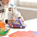 Składanie samochodów jest proste, bezpieczne i zapewnia mnóstwo zabawy. Na koniec dodaj koła, naklejki i dekoracje. Dzieci mogą spróbować pracy z różnymi materiałami - papierem, drewnianymi patyczkami i kołami. Rezultatem są piękne samochody 3D, którymi mogą się bawić. Ale to nie wszystko - zestaw zawiera również 2 sztuki bramek wyścigowych 3D, dzięki którym można organizować prawdziwe wyścigi.