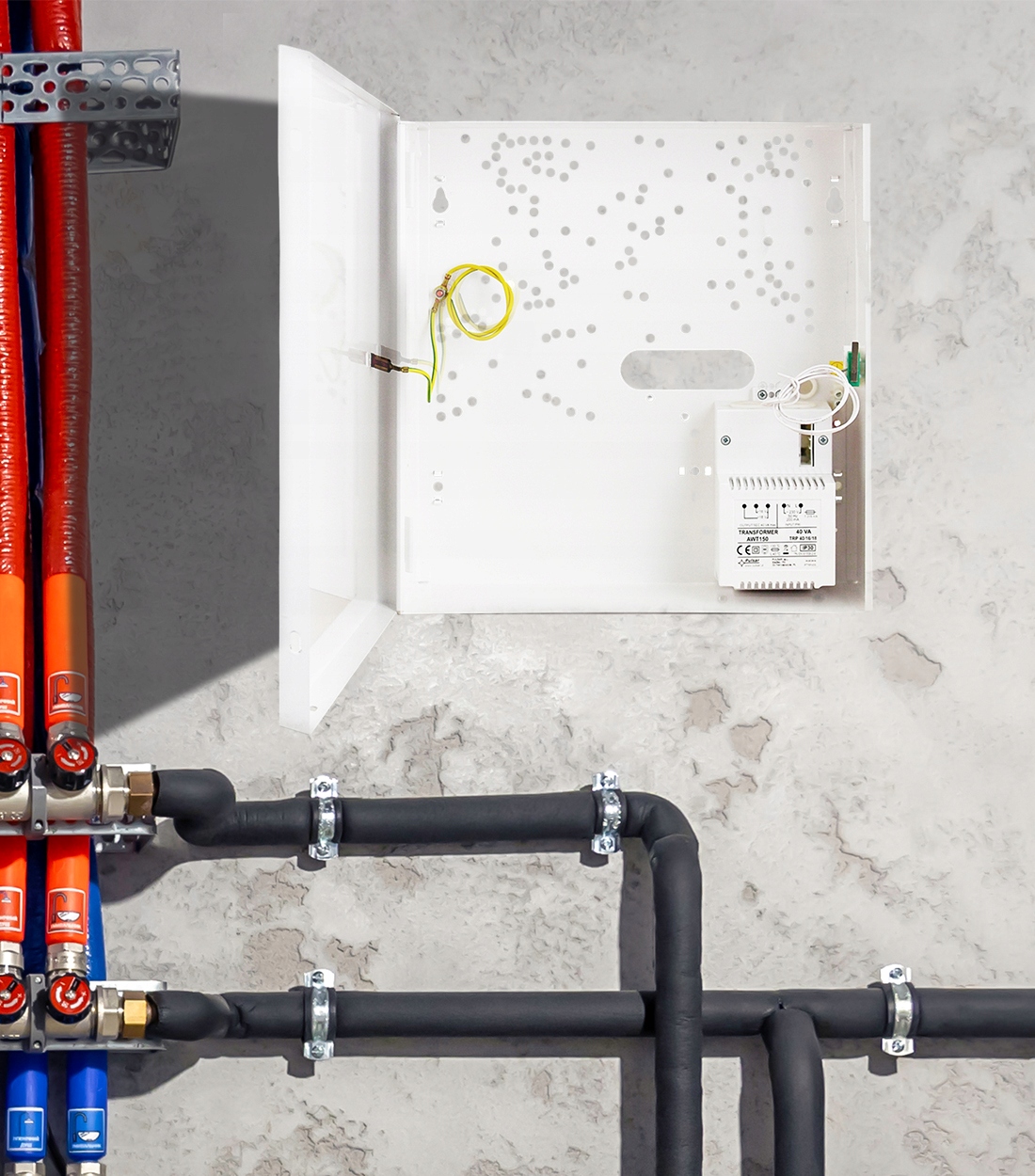 Wytrzymała i estetyczna obudowa natynkowa do montażu central i modułów alarmowych wewnątrz pomieszczeń (IP20). Wyposażona w transformator TRP 40VA (16V/18V), miejsce na akumulator 7Ah/12V oraz zabezpieczenie antysabotażowe, które chroni przed nieautoryzowanym otwarciem.