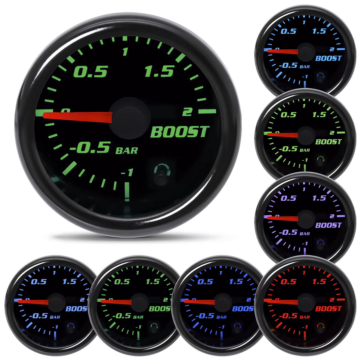 Wskaźnik podciśnienia turbosprężarki 12V 2" 52 mm -1~2 bary, 7-kolorowa dioda LED, czarna soczewka