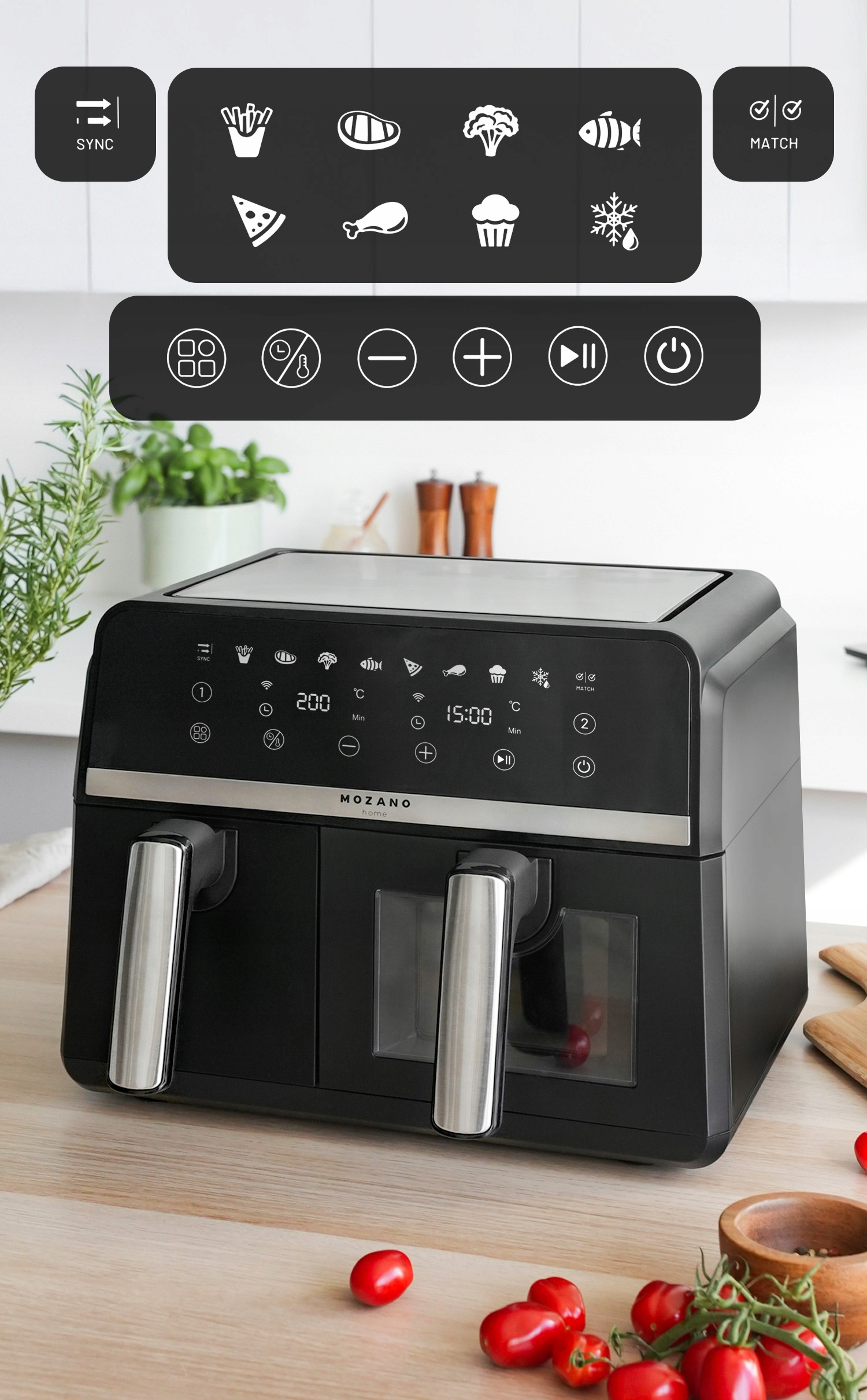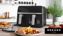 Frytkownica beztłuszczowa Mozano DuoFry Unlimited z dwoma niezależnymi koszami (3,5 l i 5,5 l – łącznie aż 9 l) pozwala przygotować różne potrawy jednocześnie, zachowując ich naturalny smak i wartości odżywcze. Dzięki technologii cyrkulacji powietrza 360°C dania są chrupiące na zewnątrz i soczyste w środku, przy minimalnym użyciu tłuszczu.