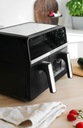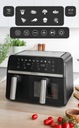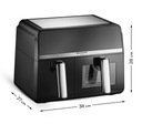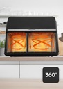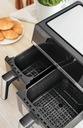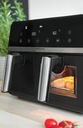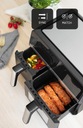 Moc 2600W | 8 programów | Dwie komory 5,5L + 3,5L = 9L | Kratka do pieczenia | Dotykowy panel | Zakres temperatur 40 - 200°C | Czas pracy do 60 min | Okienko | Lampka kontrolna wewnątrz urządzenia | Sterowanie poprzez WiFi | Synchronizacja obu koszy | Osobna kontrola czasu i temperatury każdego kosza