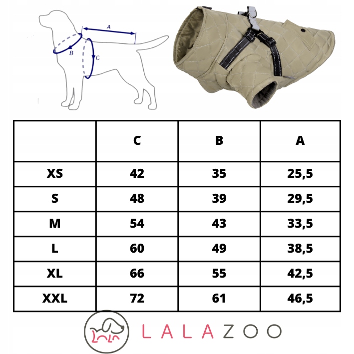 W pierwszej kolejności sprawdzamy rozmiar klatki piersiowej (C,) w drugim kroku długość grzbietu (A), dopiero na końcu obwód szyi (B/) najmniej istotny bo może być luz ;)- pamiętaj, że w tabeli podajemy wartości maksymalne, TKANINA NIE UCIĄGA SIĘ!