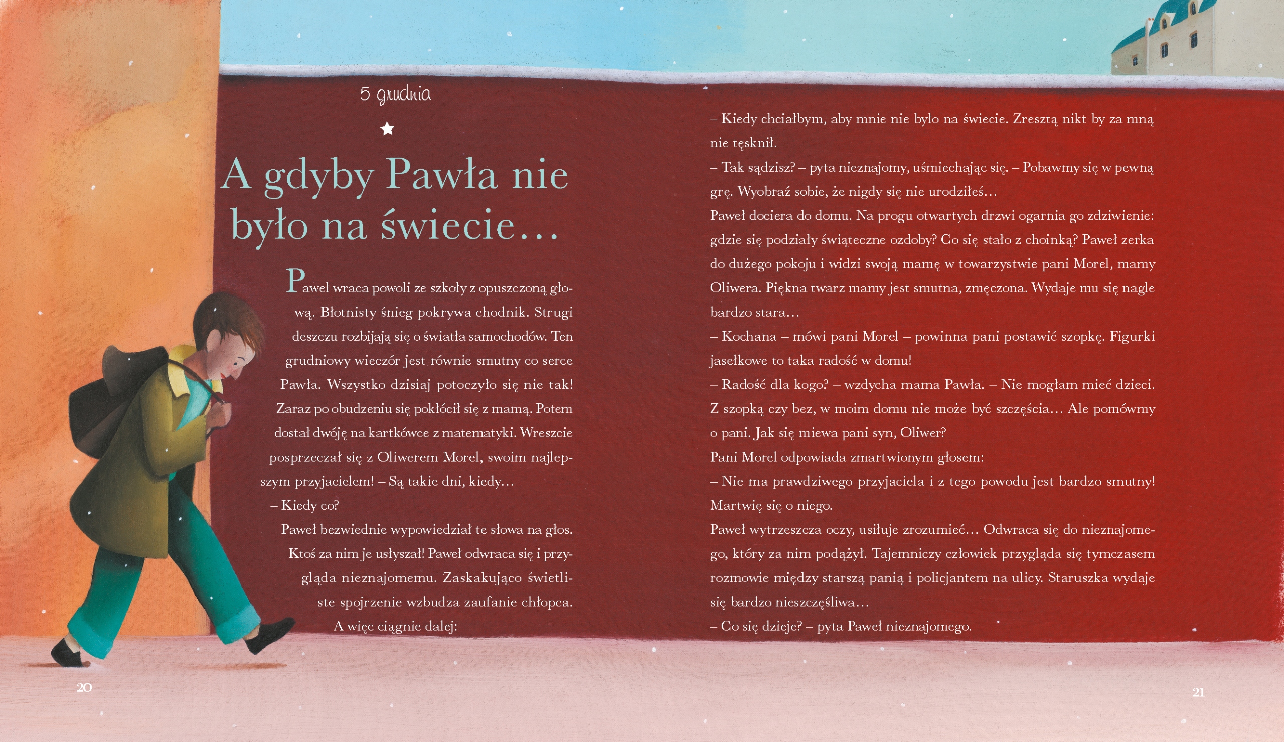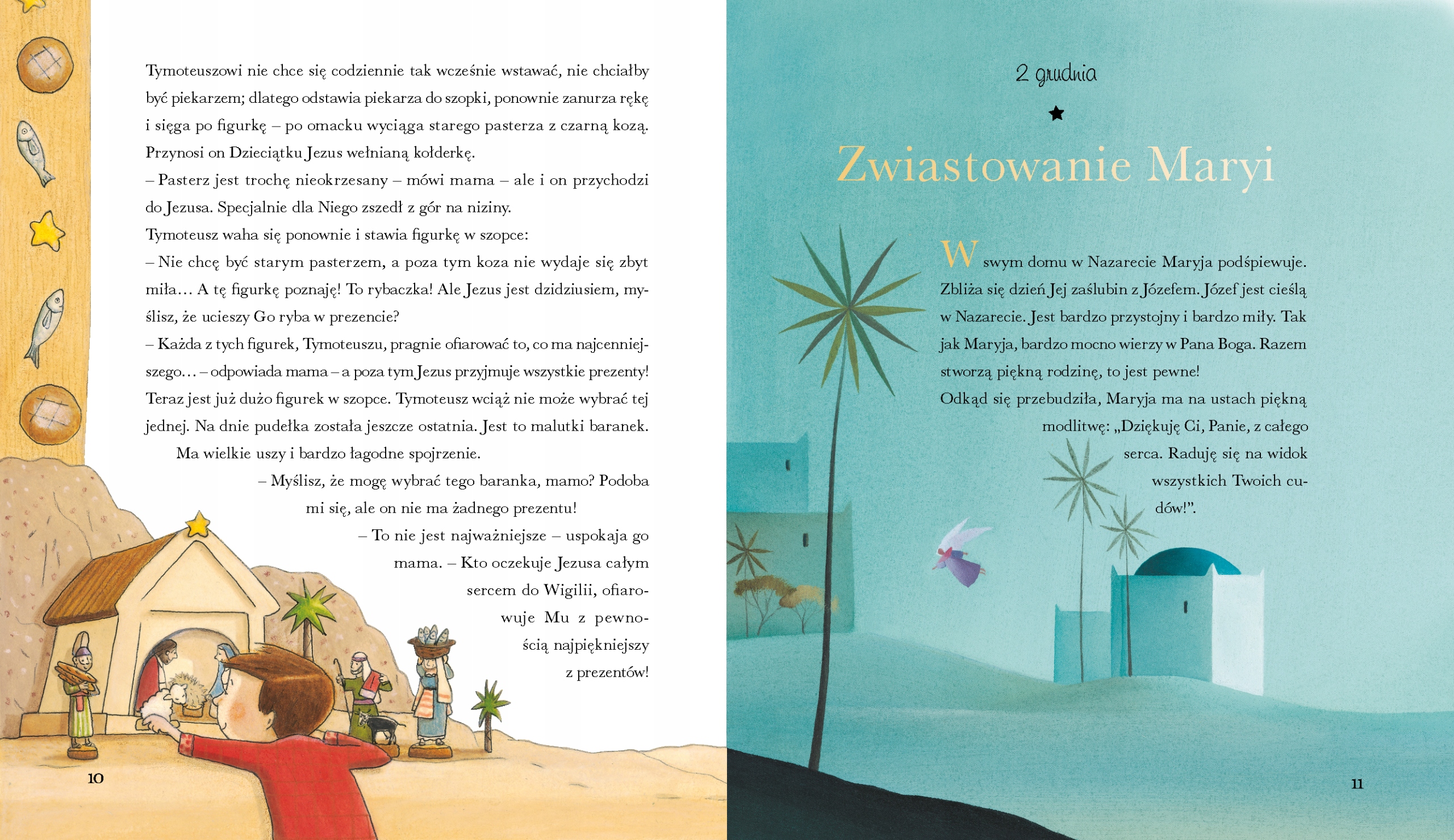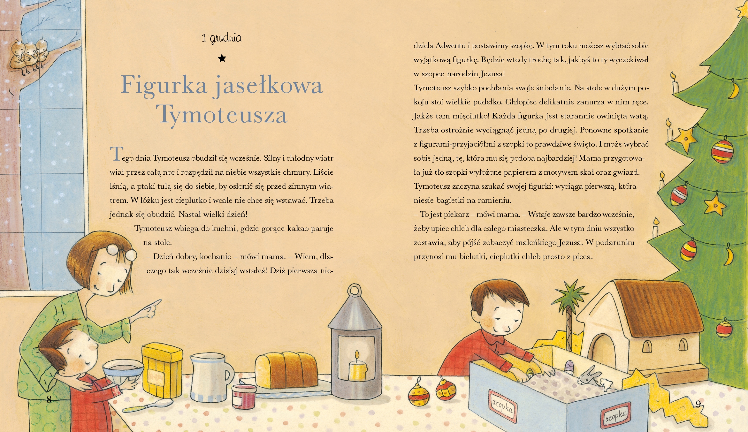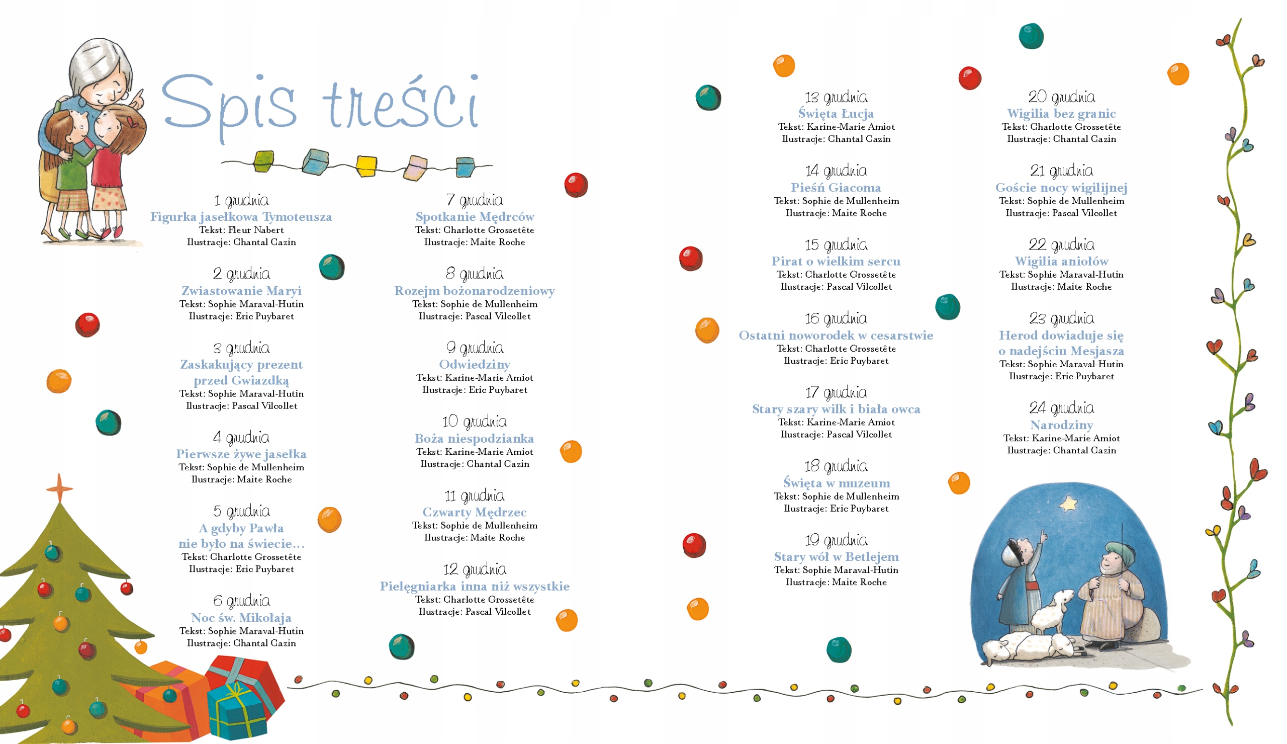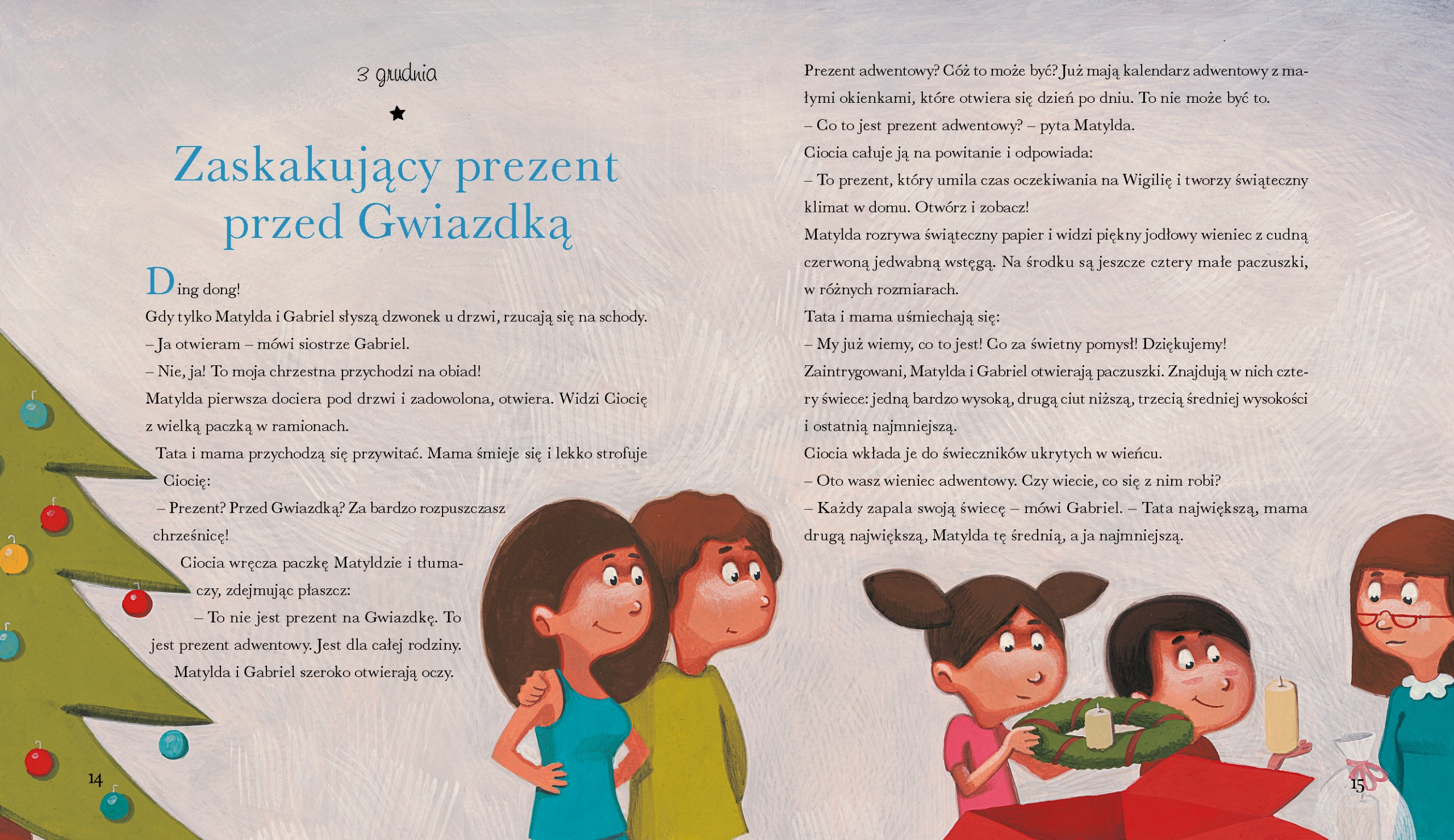 Ta piękna książka dla dzieci jest kolekcją 24 zupełnie wyjątkowych opowieści adwentowych i wigilijnych, które poniekąd pełnią funkcję kalendarza adwentowego. Codziennie w grudniu możemy wieczorkiem usiąść z naszymi pociechami i przeczytać im opowiadanie związane z Bożym Narodzeniem i tym samym umilić czas oczekiwania na Wigilię.