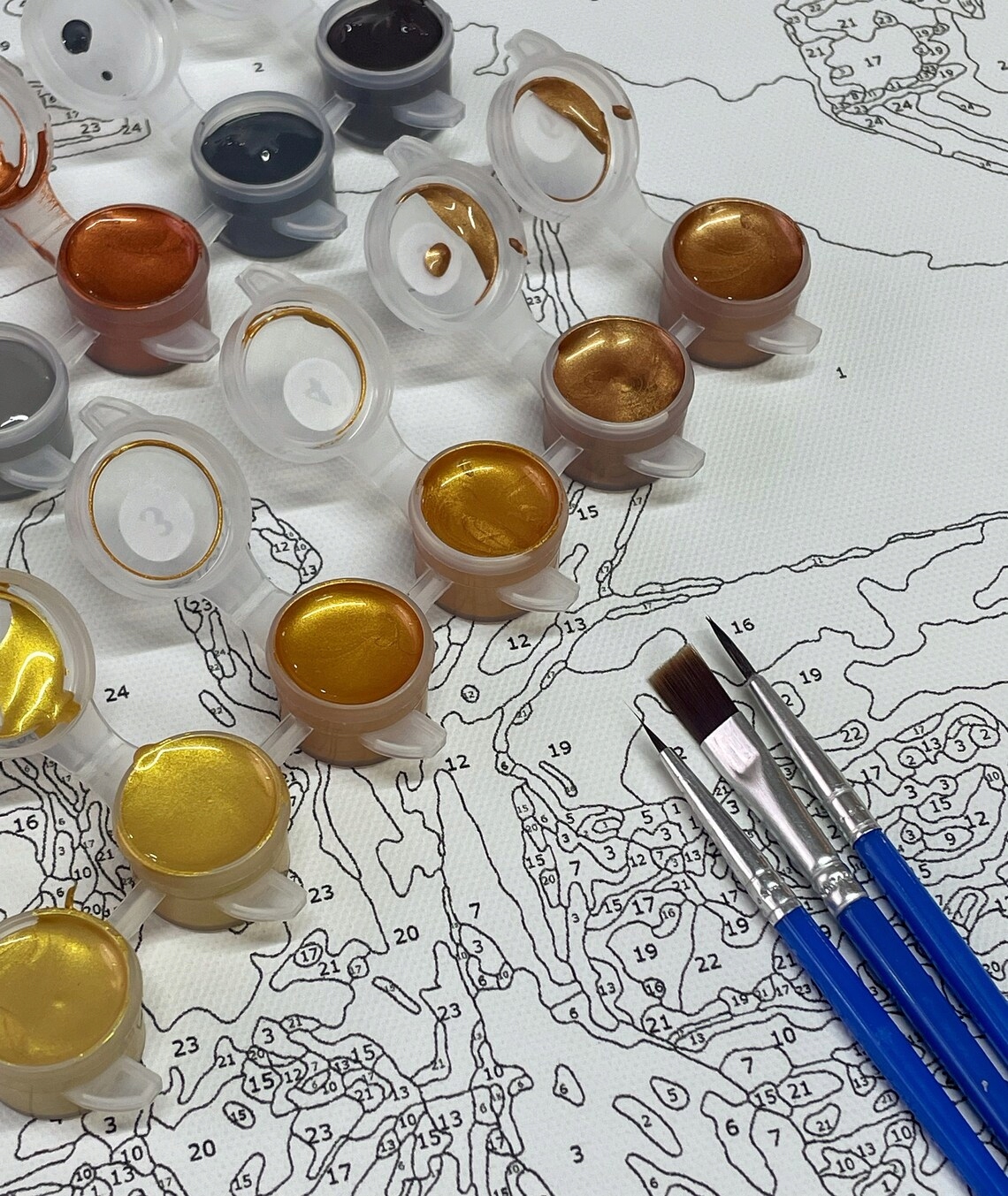 Staranny szkic obrazu z odpowiednimi numerkami i perfekcyjnym odwzorowaniem próbnika, ekologiczne płótno bawełniane rozpięte na solidnej, drewnianej ramie, doskonałe pędzelki, ekologiczne farby akrylowe, a wszystko starannie zapakowane i gotowe do sprawiania ci radości.