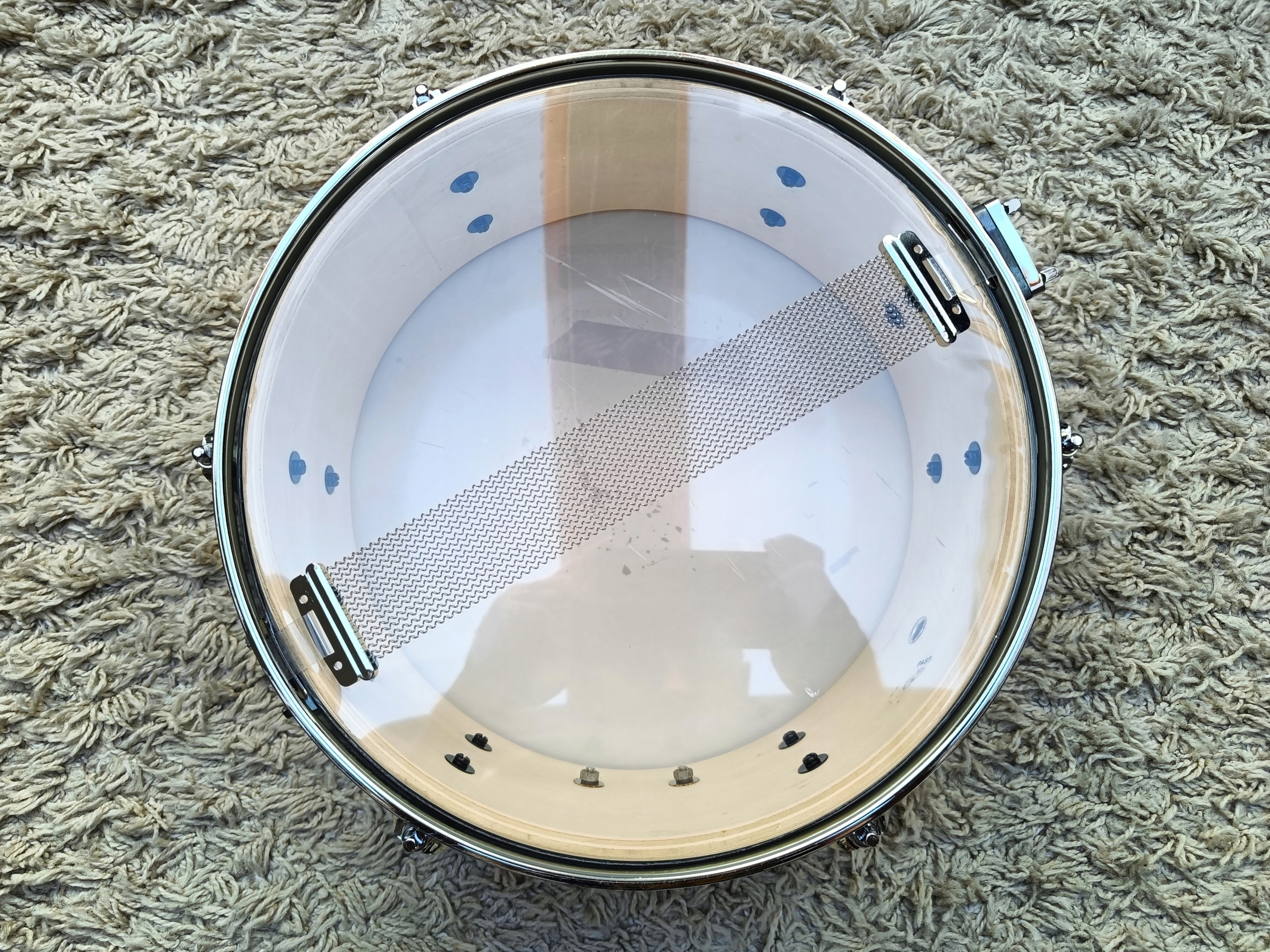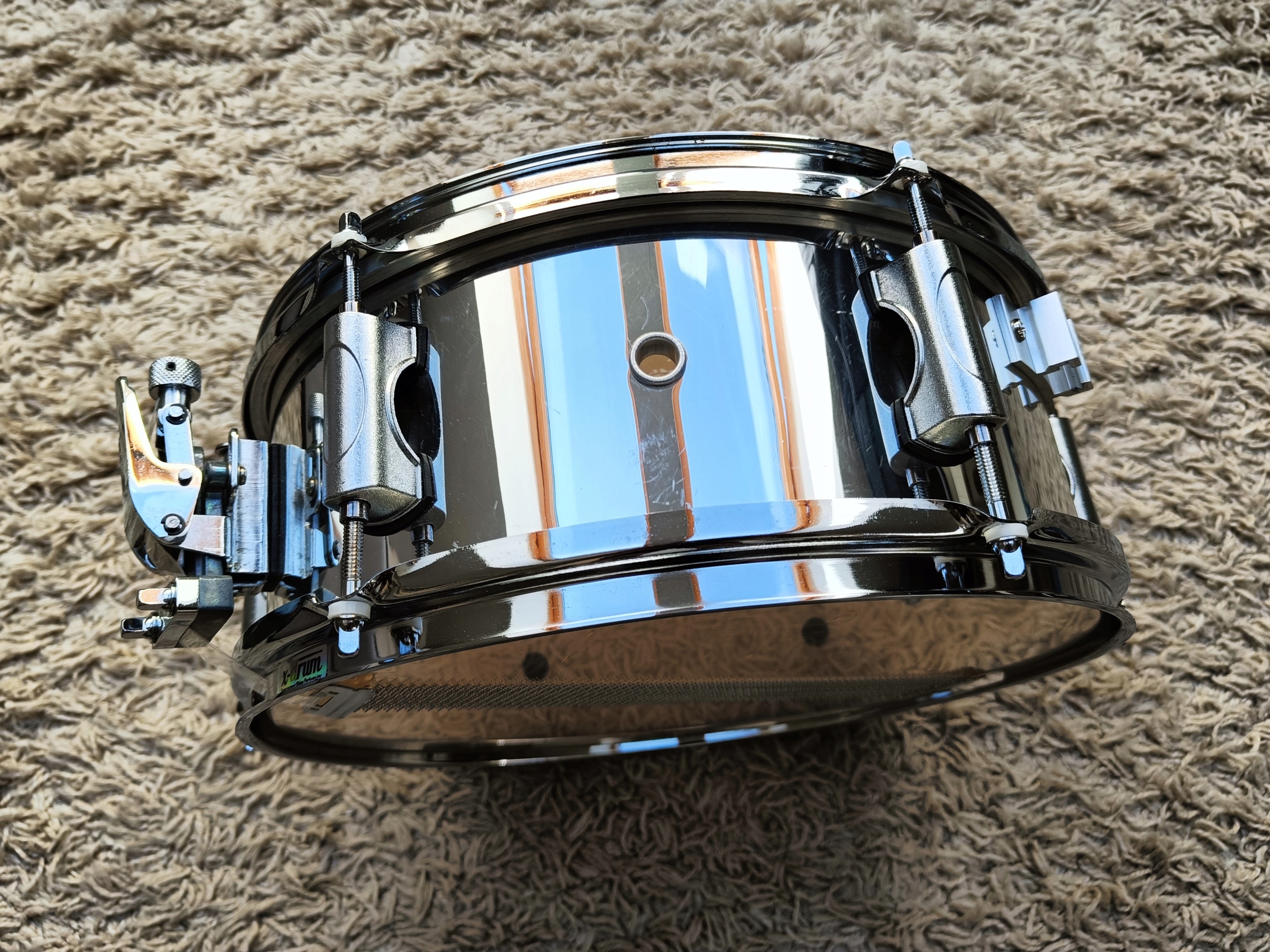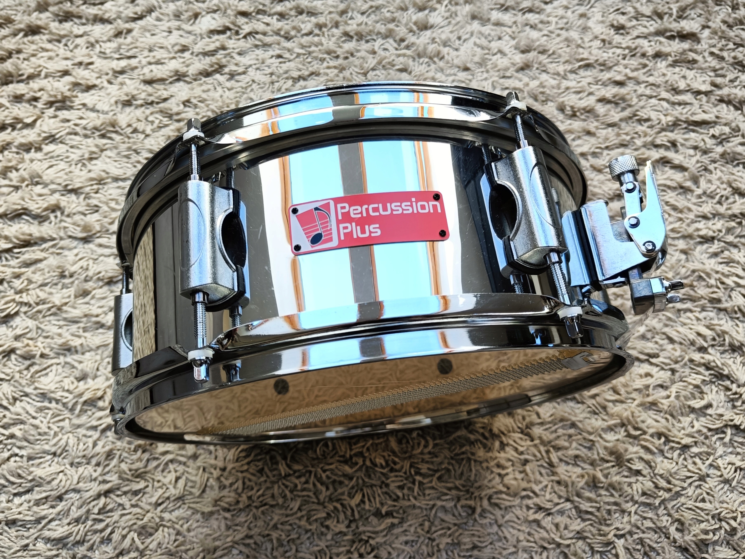 PERCUSSION PLUS PP784-H to świetny werbel efektowy brytyjskiego producenta, zbudowany na drewnianym korpusie w wykończeniu "Metallic Silver", wyposażony w solidną maszynkę, strojony na 6 śrub na stronę, posiada wbudowany uchwyt na nosidło.