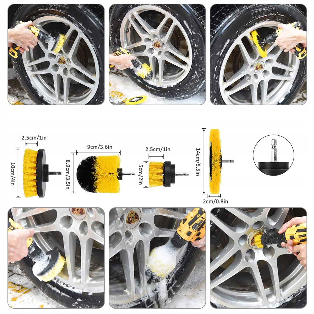 4 klasyczne szczotki wiertarskie wykonane z wysokiej jakości polipropylenu, odporne na zużycie i ciepło. Idealne do pielęgnacji piast samochodowych i czyszczenia podłóg w łazienkach, cementu, tapicerki, płytek, pryszniców, kuchni, wanien i dywanów.