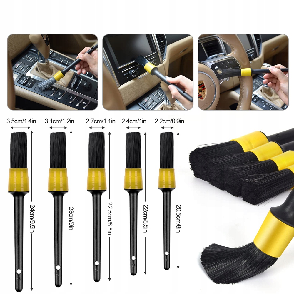 5 najwyższej jakości szczotek do czyszczenia w różnych rozmiarach wykonanych z jedwabiu PP, zmieszanych z włosiem i mikrofibrą, do wszelkich prac czyszczących wewnątrz i na zewnątrz samochodu. Włosie jest wystarczająco twarde, aby się poruszać, ale wystarczająco miękkie, aby nie uszkodzić delikatnych powierzchni.