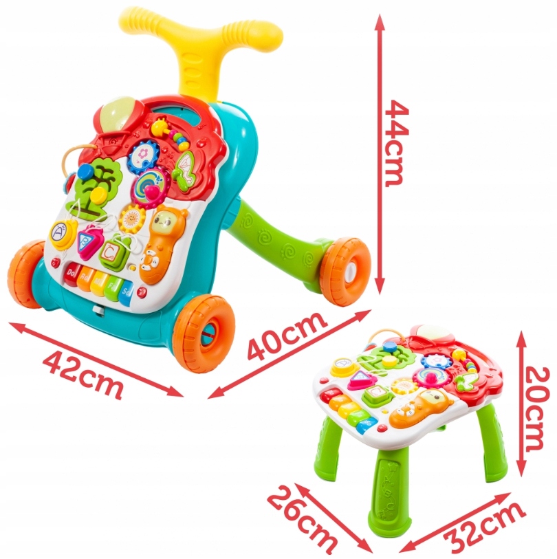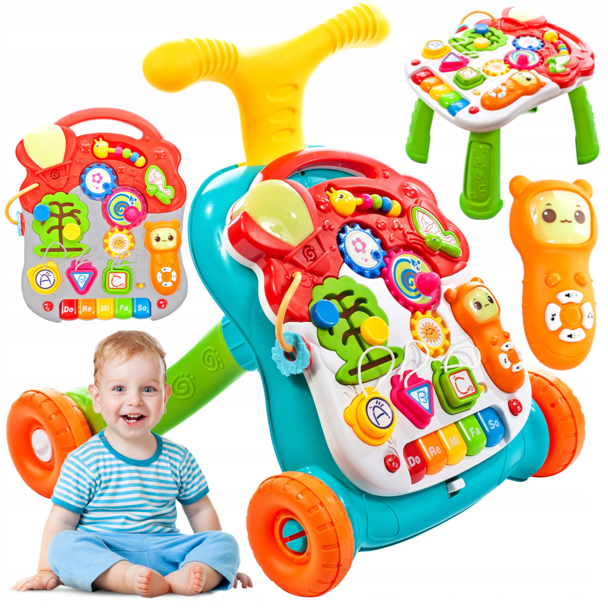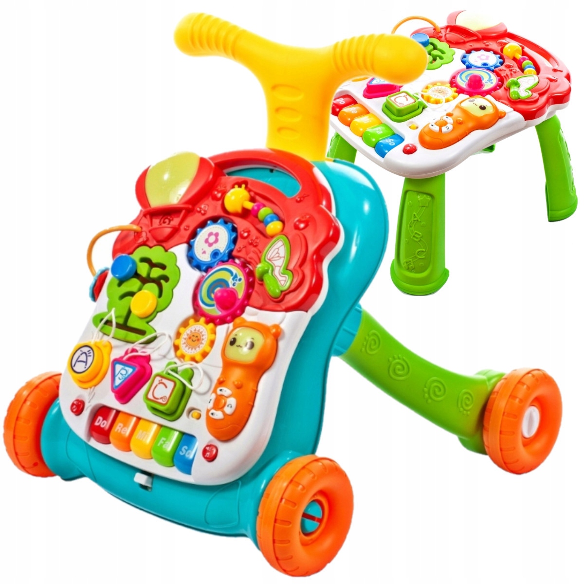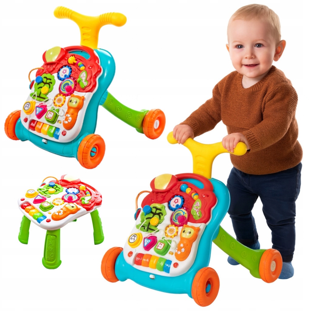 Łatwy w montażu jeździk łączy funkcję pchacza, stolika edukacyjnego i panelu do łóżeczka, zapewniając wiele możliwości zabawy i nauki.