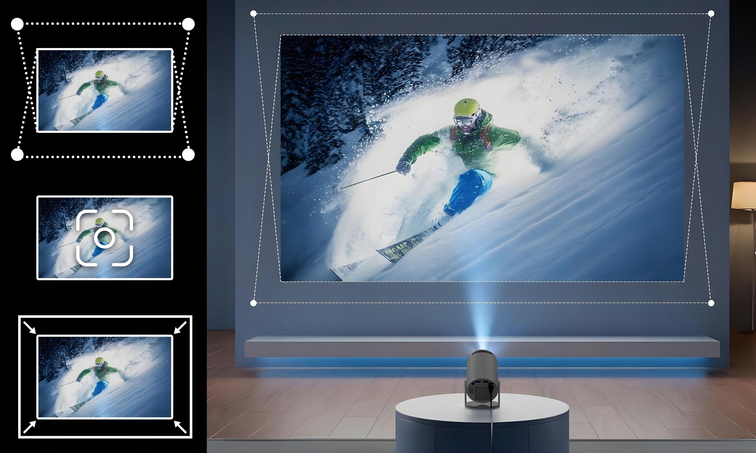 Postaw projektor gdzie chcesz — TAVO HY300 PRO+ zrobi resztę. Dzięki 4-wymiarowej korekcji trapezu i autokorekcji obraz prostuje się sam, bez żmudnego przesuwania i kręcenia śrubami. Efekt: prostokątny, równy ekran gotowy do seansu w kilka sekund.