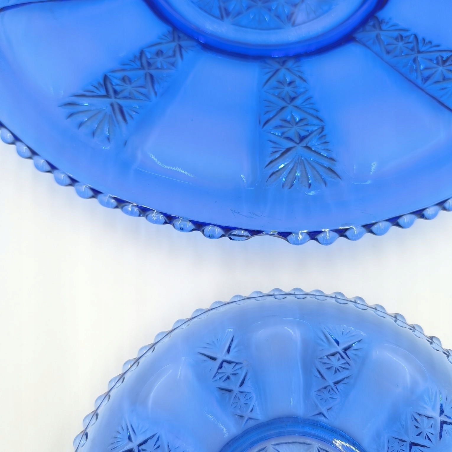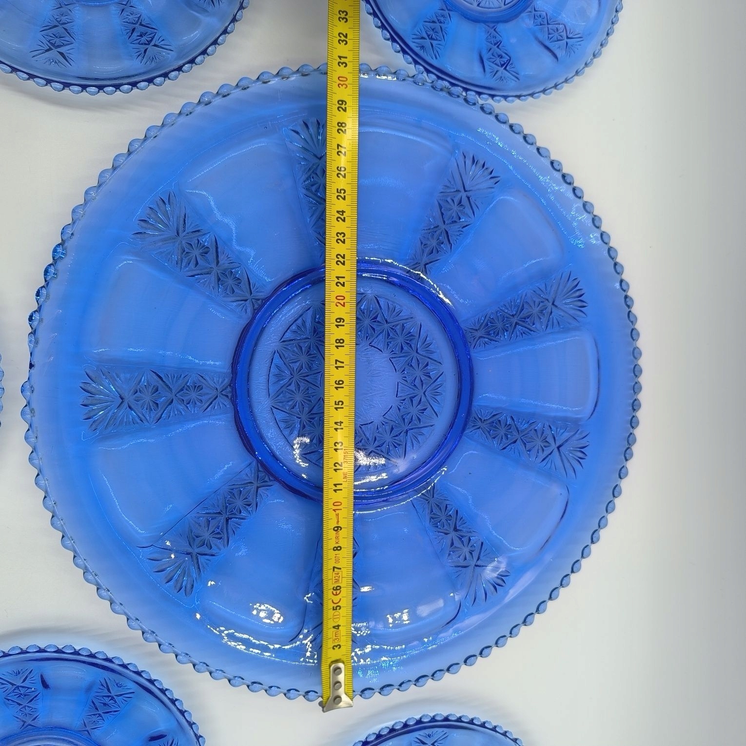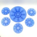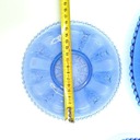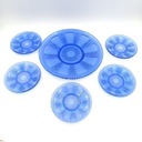 Zestaw składający się z dużej patery oraz pięciu talerzyków deserowych wykonanych z niebieskiego szkła prasowanego. Dekoracyjne tłoczenia w formie geometrycznych motywów nadają całości eleganckiego, ponadczasowego charakteru. Zdobione krawędzie patery i talerzyków dodają lekkości i klasy. Idealny komplet do podawania ciast, owoców czy przekąsek – piękna ozdoba stołu w stylu vintage.