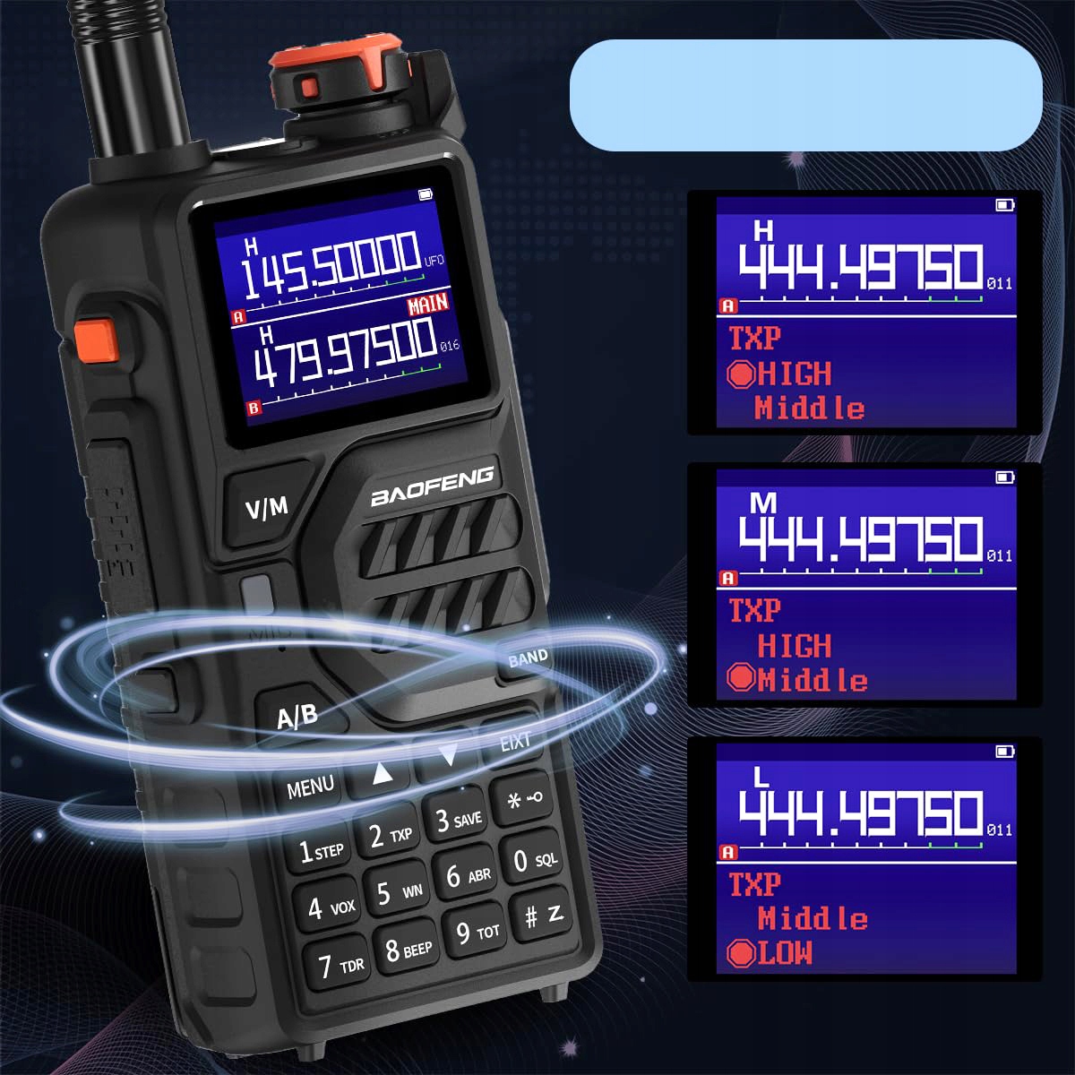 Walkie-talkie K5PLUS został wyposażony w kolorowy wyświetlacz 1,77 cala z funkcją czytelnego podglądu w nocy. Posiada trzystopniową regulację mocy (niska/średnia/wysoka) ⚡ pozwalającą idealnie dostosować zasięg do potrzeb.