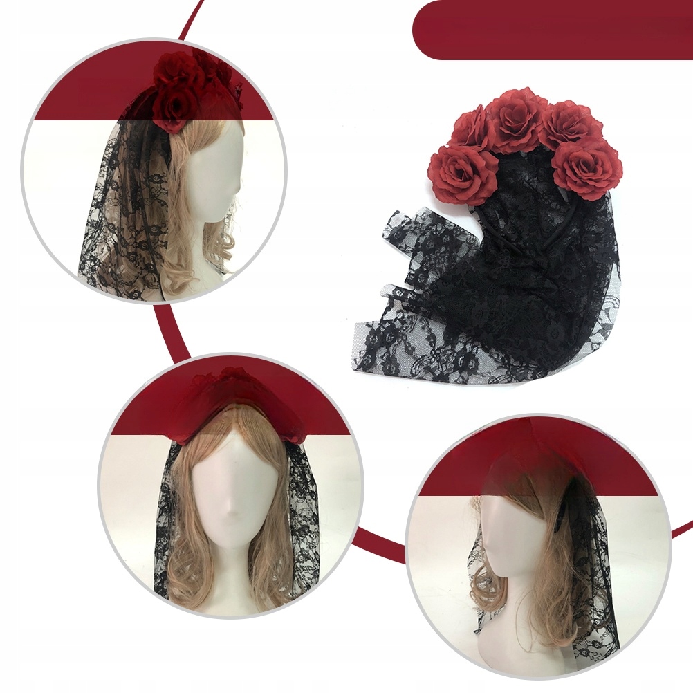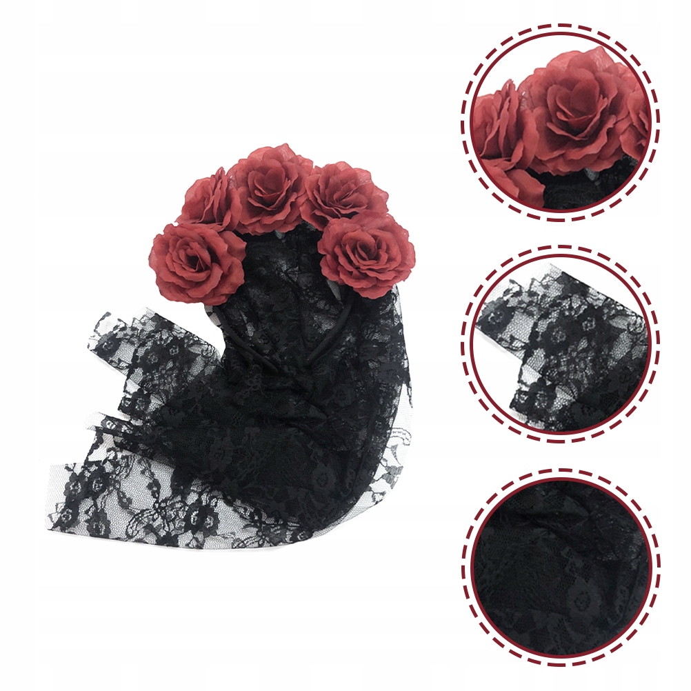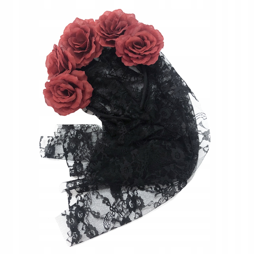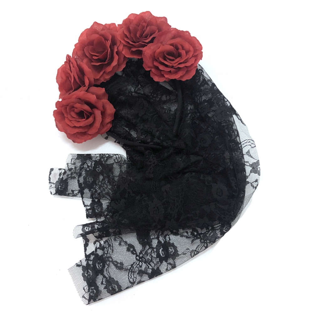 ✅Czarny koronkowy welon na opasce z dołączonymi czerwonymi różami, idealna fantazyjna sukienka dodatek na Halloween