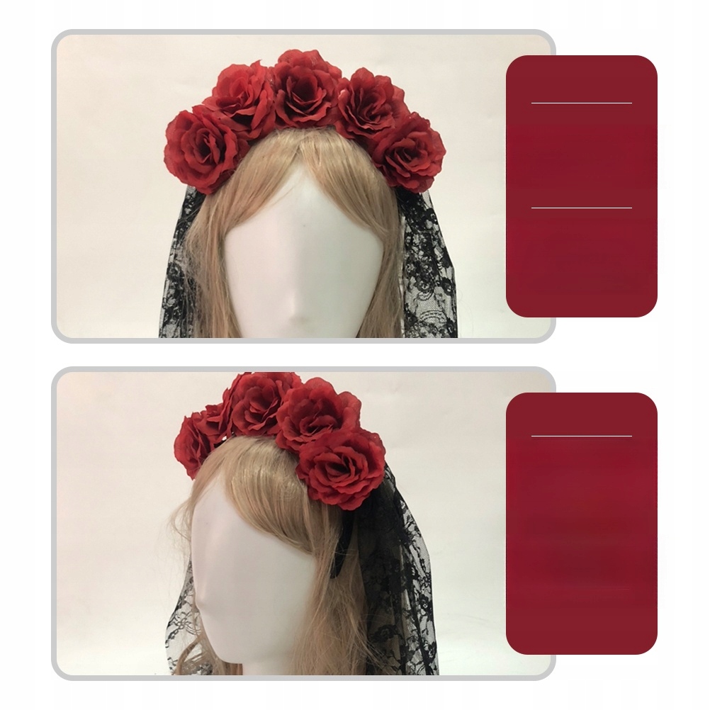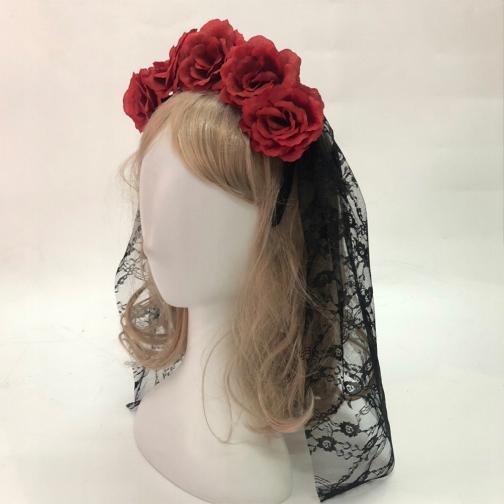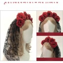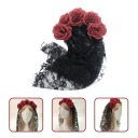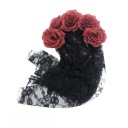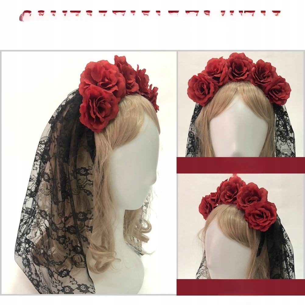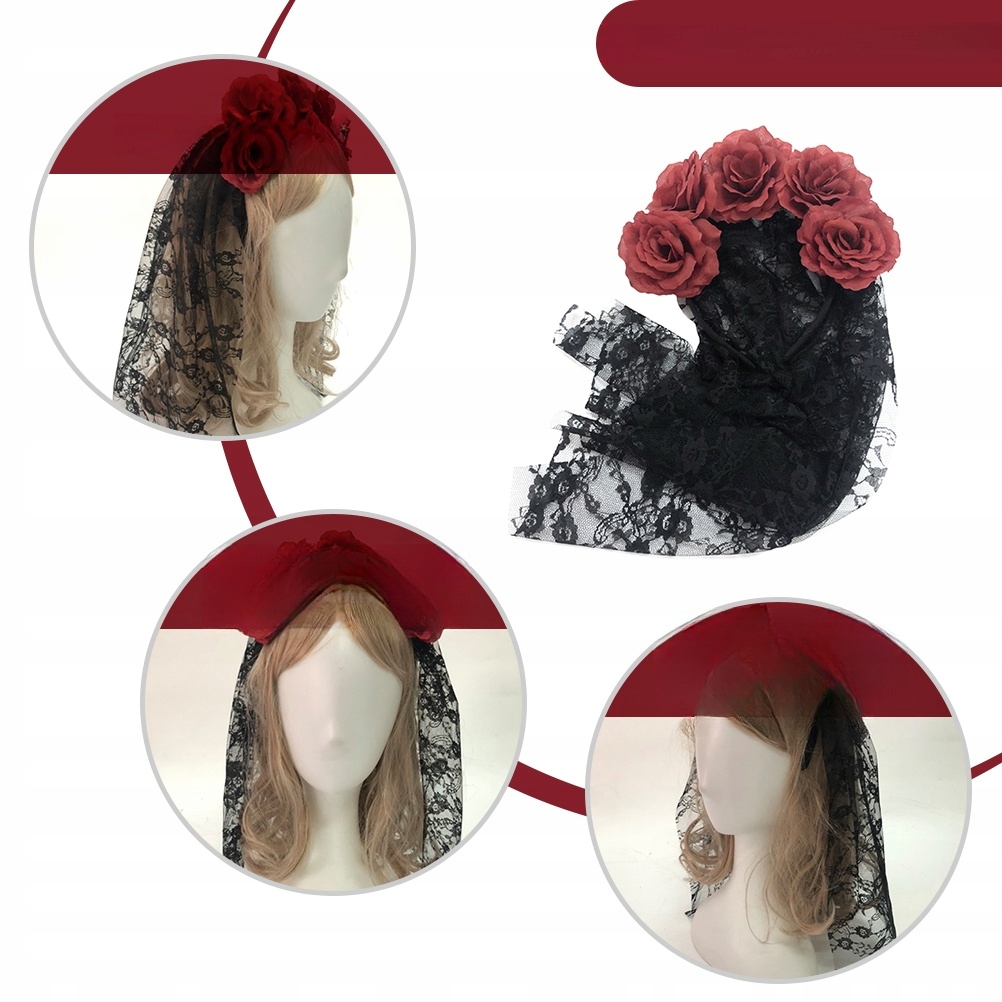 ✅Czarny koronkowy welon na opasce z dołączonymi czerwonymi różami, idealna fantazyjna sukienka dodatek na Halloween