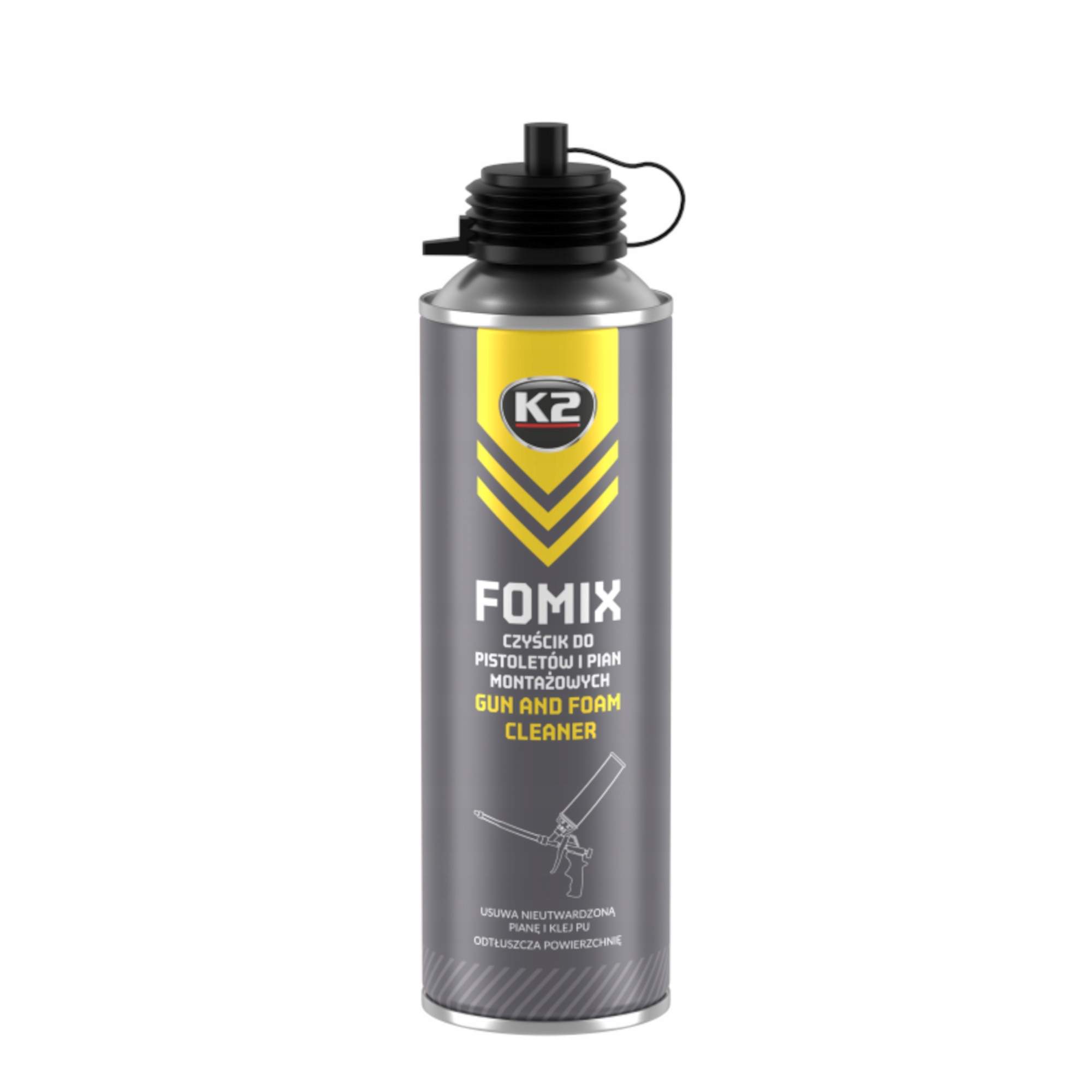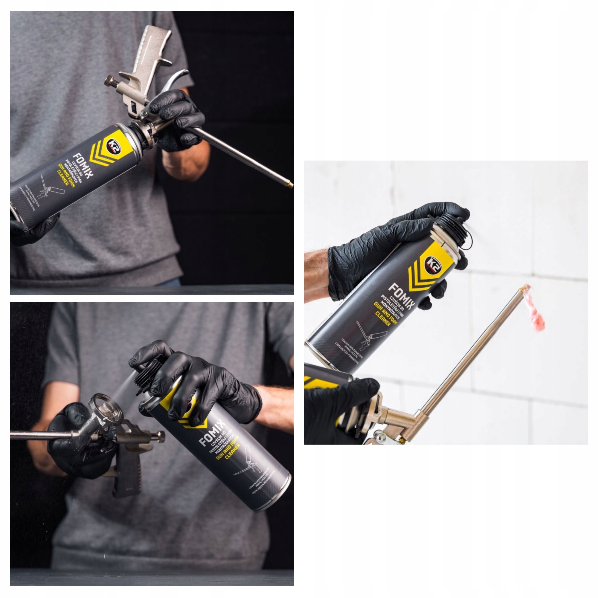 2. Czyszczenie narzędzi (Pistoletu): Odkręcić pojemnik z pianą lub klejem od pistoletu. Nacisnąć dźwignię pistoletu, aby wypuścić resztki substancji. Nałożyć dysze na zawór czyścika, spryskać nim zawór puszki i adapter pistoletu. Zdjąć dysze i ponownie nakręcić pistolet na pojemnik. Naciskać dźwignię kilka razy, aż pistolet będzie całkowicie oczyszczony z pozostałości piany lub kleju. Powtarzać czynność, aż do uzyskania satysfakcjonującego efektu.