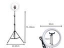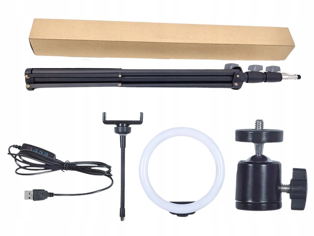 W zestawie znajduje się uchwyt na telefon, który umożliwia stabilne mocowanie smartfona w centrum lampy, co zapewnia równomierne i profesjonalne doświetlenie twarzy. Regulowany statyw o wysokości do 100 cm pozwala na wygodne ustawienie lampy w optymalnej pozycji. Zasilanie poprzez USB sprawia, że lampka jest wygodna w użytkowaniu i kompatybilna z laptopami, powerbankami czy adapterami sieciowymi.