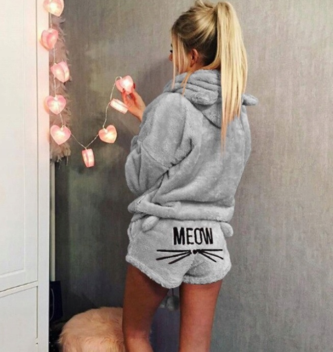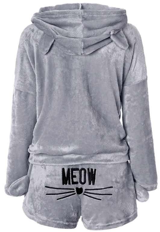 ✅ВИД - он серого цвета с милыми кошачьими ушками на капюшоне и шортах, сзади шорт есть кошачья морда и надпись MEOW.