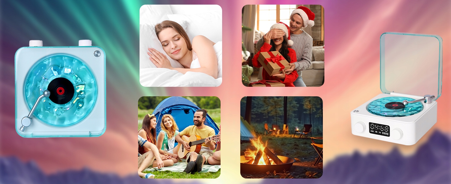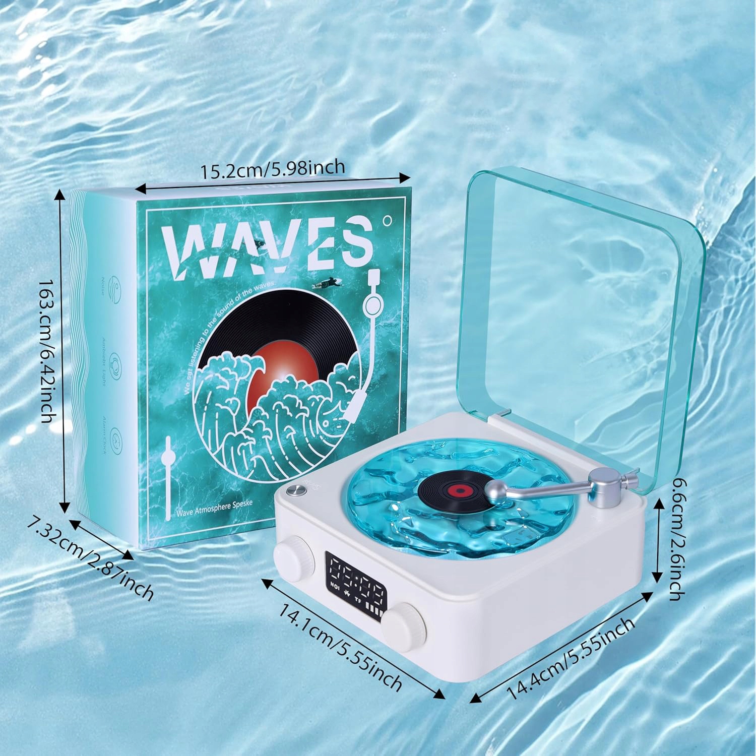 Ostrożnie obracając ramię gramofonu, projekcja falowania wody prezentuje różną atmosferę, a płyta gramofonowa obraca się.