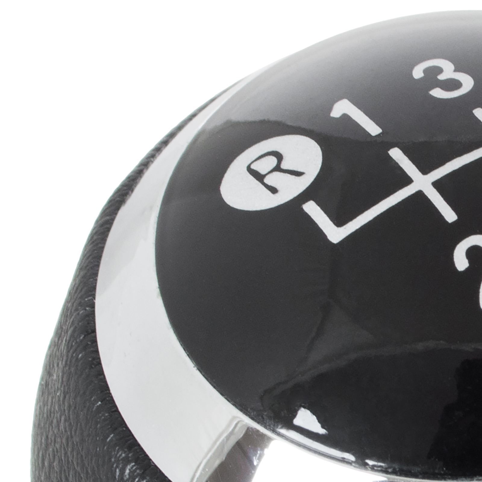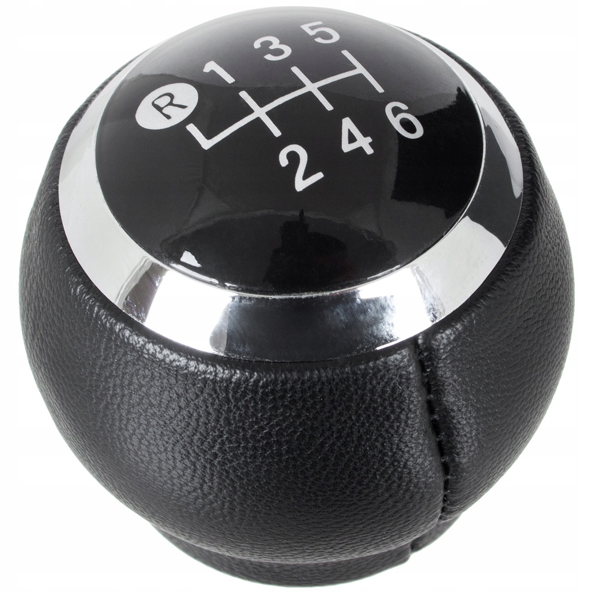 Schemat: nakładka w kolorze czarnym błyszczącym z chromowym pierścieniem i jasnoszarym schematem: 6 biegów + wsteczny